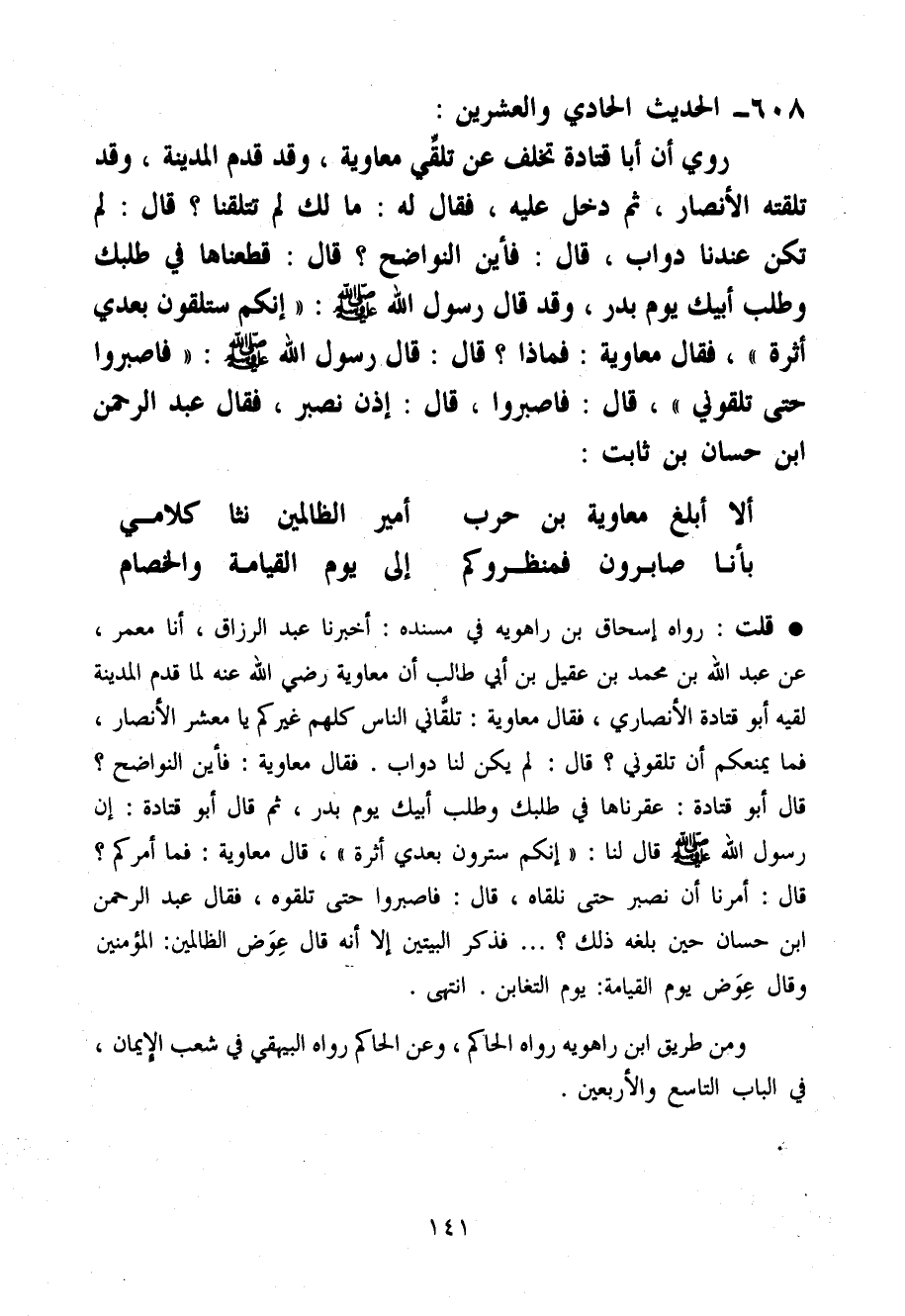 قلت رَوَاهُ إِسْحَاق بن رَاهَوَيْه فِي مُسْنده أخبرنَا عبد الرَّزَّاق أَنا معمر عَن عبد الله بن مُحَمَّد بن عقيل بن أبي طَالب أَن مُعَاوِيَة رَضِيَ اللَّهُ عَنْه لما قدم الْمَدِينَة لقِيه أَبُو قَتَادَة الْأنْصَارِيّ فَقَالَ مُعَاوِيَة تَلقانِي النَّاس كلهم غَيْركُمْ يَا معشر الْأَنْصَار فَمَا يمنعكم أَن تَلْقَوْنِي قَالَ لم يكن لنا دَوَاب فَقَالَ مُعَاوِيَة فَأَيْنَ النَّوَاضِح قَالَ أَبُو قَتَادَة عقرناها فِي طَلَبك وَطلب أَبِيك يَوْم بدر ثمَّ قَالَ أَبُو قَتَادَة إِن رَسُول الله صَلَّى اللَّهُ عَلَيْهِ وَسَلَّم َ قَالَ لنا (إِنَّكُم سَتَلْقَوْنَ بعدِي أَثَرَة) قَالَ مُعَاوِيَة فَمَا أَمركُم قَالَ أمرنَا أَن نصبر حَتَّى نَلْقَاهُ قَالَ فَاصْبِرُوا حَتَّى تلقوهُ فَقَالَ عبد الرَّحْمَن ابْن حسان حِين بلغه ذَلِك ... فَذكر الْبَيْتَيْنِ إِلَّا أَنه قَالَ عوض الظَّالِمين الْمُؤمنِينَ وَقَالَ عوض يَوْم الْقِيَامَة يَوْم التغابن