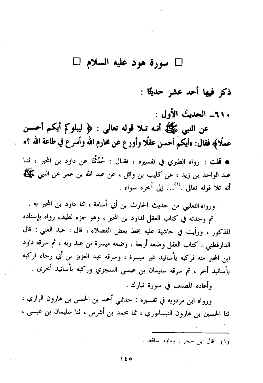 ثمَّ وجدته فِي كتاب الْعقل لداود بن المحبر وَهُوَ جُزْء لطيف رَوَاهُ بِإِسْنَادِهِ الْمَذْكُور وَرَأَيْت فِي حَاشِيَة عَلَيْهِ بِخَط بعض الْفُضَلَاء قَالَ عبد الْغَنِيّ قَالَ الدَّارَقُطْنِيّ كتاب الْعقل وَضعه أَرْبَعَة وَضعه ميسرَة بن عبد ربه ثمَّ سَرقه دَاوُد ابْن المحبر مِنْهُ فَرَكبهُ بأسانيد غير ميسرَة وَسَرَقَهُ عبد الْعَزِيز بن أبي رَجَاء فَرَكبهُ بأسانيد أخر ثمَّ سَرقه سُلَيْمَان بن عِيسَى السجْزِي وَركبهُ بأسانيد أُخْرَى
