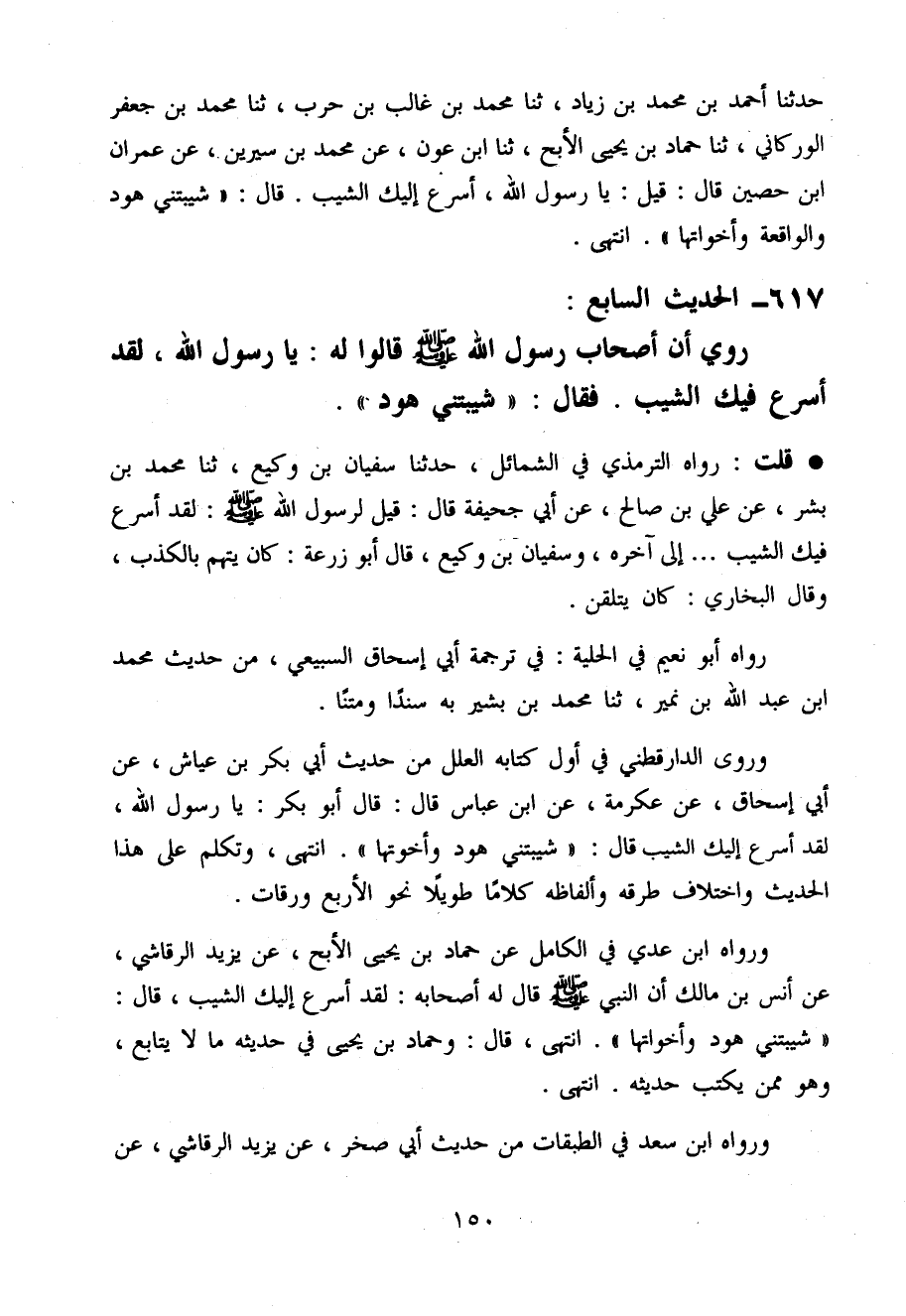 وَرَوَى الدَّارَقُطْنِيّ فِي أول كِتَابه الْعِلَل من حَدِيث أبي بكر بن عَيَّاش عَن أبي إِسْحَاق عَن عِكْرِمَة عَن ابْن عَبَّاس قَالَ قَالَ أَبُو بكر يَا رَسُول الله لقد أسْرع إِلَيْك الشيب قَالَ (شيبتني هود وَأُخُوَّتهَا)