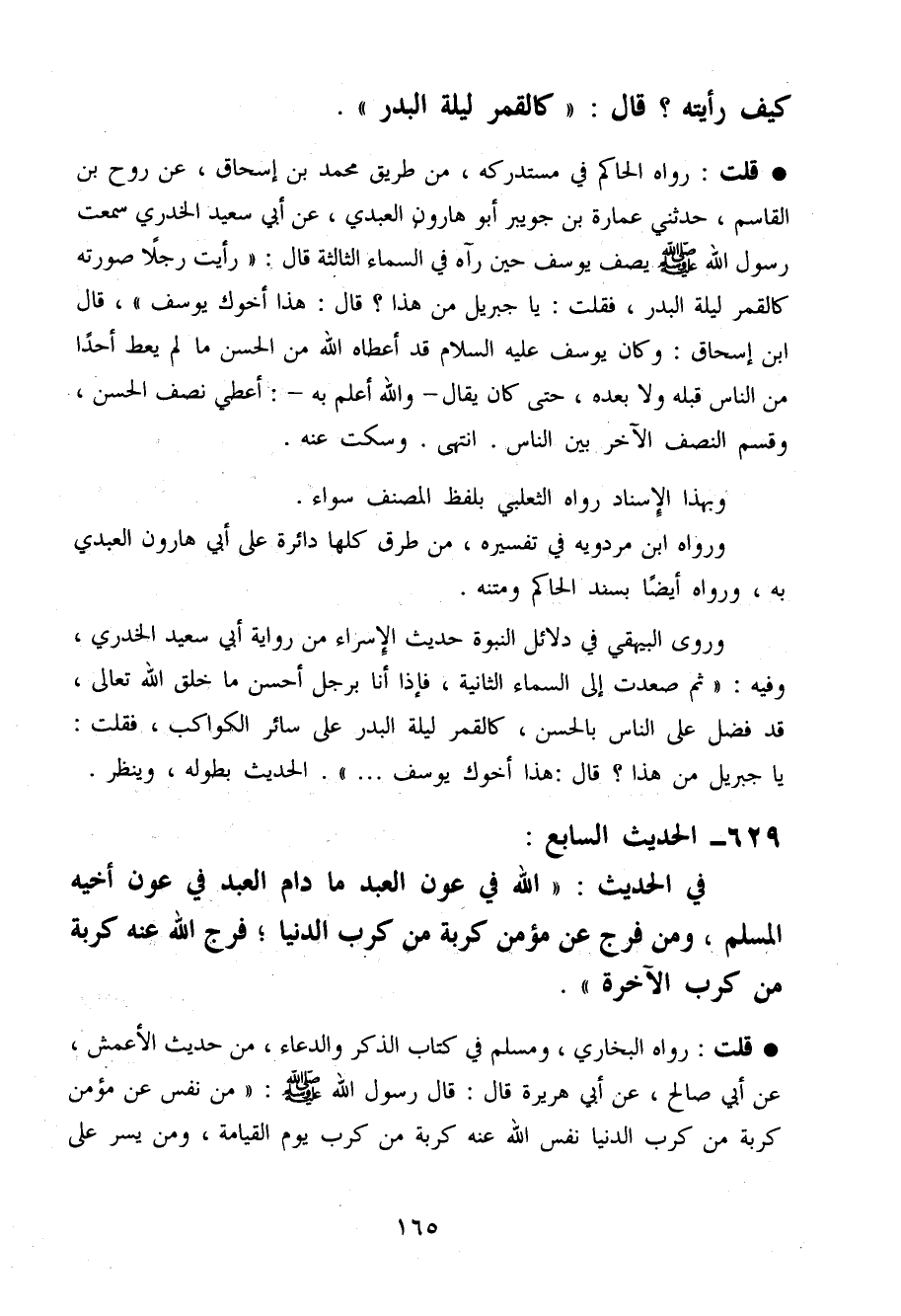 قلت رَوَاهُ الْحَاكِم فِي مُسْتَدْركه من طَرِيق مُحَمَّد بن إِسْحَاق عَن روح بن الْقَاسِم حَدثنِي عمَارَة بن جُوَيْبِر أَبُو هَارُون الْعَبْدي عَن أبي سعيد الْخُدْرِيّ سَمِعت رَسُول الله صَلَّى اللَّهُ عَلَيْهِ وَسَلَّم َ يصف يُوسُف حِين رَآهُ فِي السَّمَاء الثَّالِثَة قَالَ (رَأَيْت رجلا صورته كَالْقَمَرِ لَيْلَة الْبَدْر فَقلت يَا جِبْرِيل من هَذَا قَالَ هَذَا أَخُوك يُوسُف) قَالَ ابْن إِسْحَاق وَكَانَ يُوسُف عَلَيْهِ السَّلَام قد أعطَاهُ الله من الْحسن مَا لم يُعْط أحدا من النَّاس قبله وَلَا بعده حَتَّى كَانَ يُقَال وَالله أعلم بِهِ أعطي نصف الْحسن وَقسم النّصْف الآخر بَين النَّاس