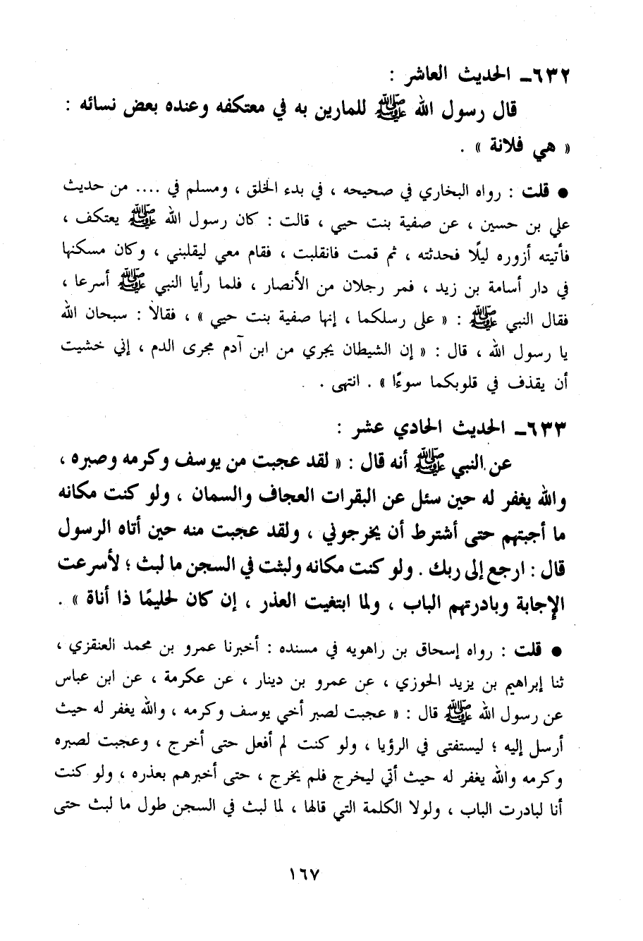 قلت رَوَاهُ البُخَارِيّ فِي صَحِيحه فِي بَدْء الْخلق وَمُسلم فِي ... من حَدِيث عَلّي بن حُسَيْن عَن صَفِيَّة بنت حييّ قَالَت كَانَ رَسُول الله صَلَّى اللَّهُ عَلَيْهِ وَسَلَّم َ يعْتَكف فَأَتَيْته أَزورهُ لَيْلًا فَحَدَّثته ثمَّ قُمْت فَانْقَلَبت فَقَامَ معي لِيقلبنِي وَكَانَ مَسْكَنهَا فِي دَار أُسَامَة بن زيد فَمر رجلَانِ من الْأَنْصَار فَلَمَّا رَأيا النَّبِي صَلَّى اللَّهُ عَلَيْهِ وَسَلَّم َ أَسْرعَا فَقَالَ النَّبِي صَلَّى اللَّهُ عَلَيْهِ وَسَلَّم َ (عَلَى رِسْلكُمَا إِنَّهَا صَفِيَّة بنت حييّ) فَقَالَا سُبْحَانَ الله يَا رَسُول الله قَالَ (إِن الشَّيْطَان يجْرِي من ابْن آدم مجْرى الدَّم إِنِّي خشيت أَن يقذف فِي قُلُوبكُمَا سوءا)