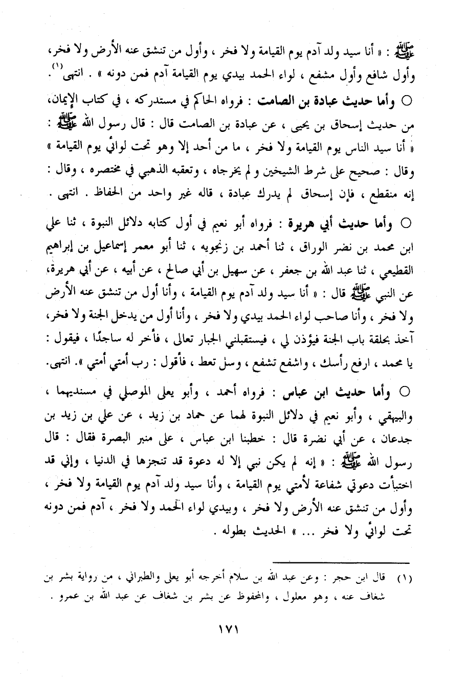 وَأما حَدِيث عبَادَة بن الصَّامِت فَرَوَاهُ الْحَاكِم فِي مُسْتَدْركه فِي كتاب الْإِيمَان من حَدِيث إِسْحَاق بن يَحْيَى عَن عبَادَة بن الصَّامِت قَالَ قَالَ رَسُول الله صَلَّى اللَّهُ عَلَيْهِ وَسَلَّم َ (أَنا سيد النَّاس يَوْم الْقِيَامَة وَلَا فَخر مَا من أحد إِلَّا وَهُوَ تَحت لِوَائِي يَوْم الْقِيَامَة) وَقَالَ صَحِيح عَلَى شَرط الشَّيْخَيْنِ وَلم يخرجَاهُ وَتعقبه الذَّهَبِيّ فِي مُخْتَصره وَقَالَ إِنَّه مُنْقَطع فَإِن إِسْحَاق لم يدْرك عبَادَة قَالَ غير وَاحِد من الْحفاظ