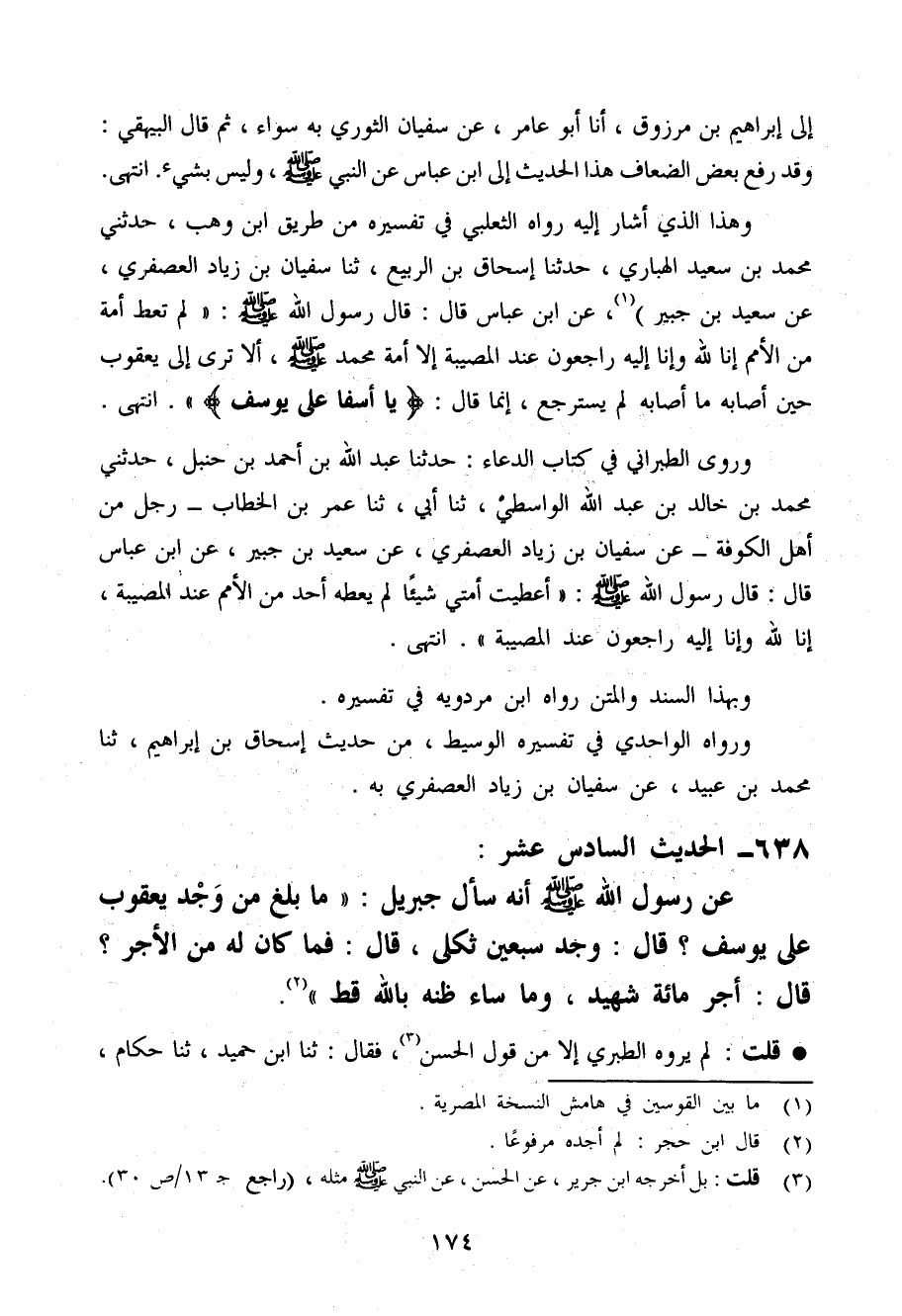 وَهَذَا الَّذِي أَشَارَ إِلَيْهِ رَوَاهُ الثَّعْلَبِيّ فِي تَفْسِيره من طَرِيق ابْن وهب حَدثنِي مُحَمَّد بن سعيد الْهَبَّاري حَدثنَا إِسْحَاق بن الرّبيع حَدثنَا سُفْيَان بن زِيَاد الْعُصْفُرِي عَن سعيد بن جُبَير عَن ابْن عَبَّاس قَالَ قَالَ رَسُول الله صَلَّى اللَّهُ عَلَيْهِ وَسَلَّم َ (لم تعط أمة من الْأُمَم إِنَّا لله وَإِنَّا إِلَيْهِ رَاجِعُون عِنْد الْمُصِيبَة إِلَّا أمة مُحَمَّد صَلَّى اللَّهُ عَلَيْهِ وَسَلَّم َ أَلا ترَى إِلَى يَعْقُوب حِين أَصَابَهُ مَا أَصَابَهُ لم يسترجع إِنَّمَا قَالَ يَا أسفا عَلَى يُوسُف)