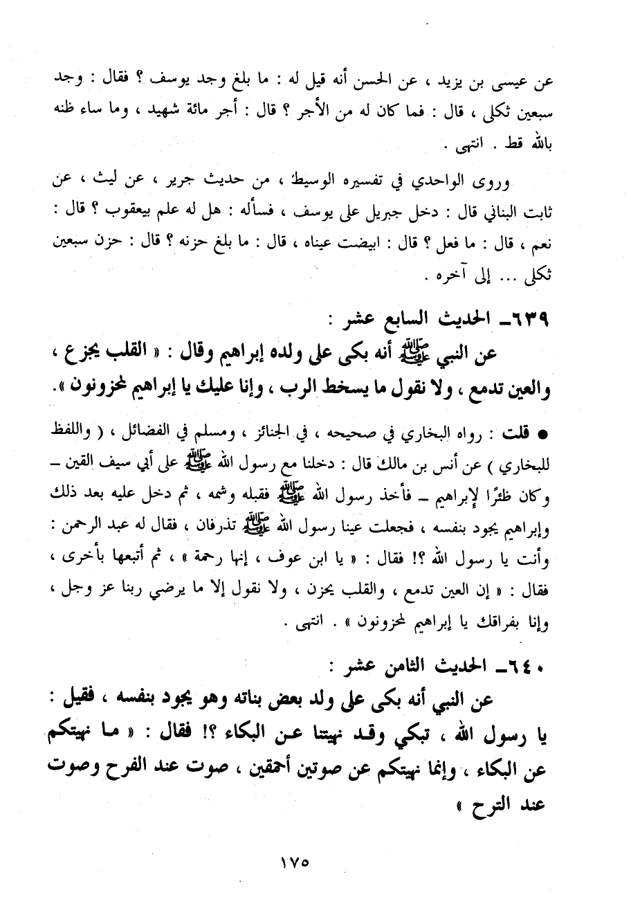 عَن النَّبِي صَلَّى اللَّهُ عَلَيْهِ وَسَلَّم َ أَنه بَكَى عَلَى وَلَده إِبْرَاهِيم وَقَالَ (الْقلب يجزع وَالْعين تَدْمَع وَلَا نقُول مَا يسْخط الرب وَإِنَّا عَلَيْك يَا إِبْرَاهِيم لَمَحْزُونُونَ)