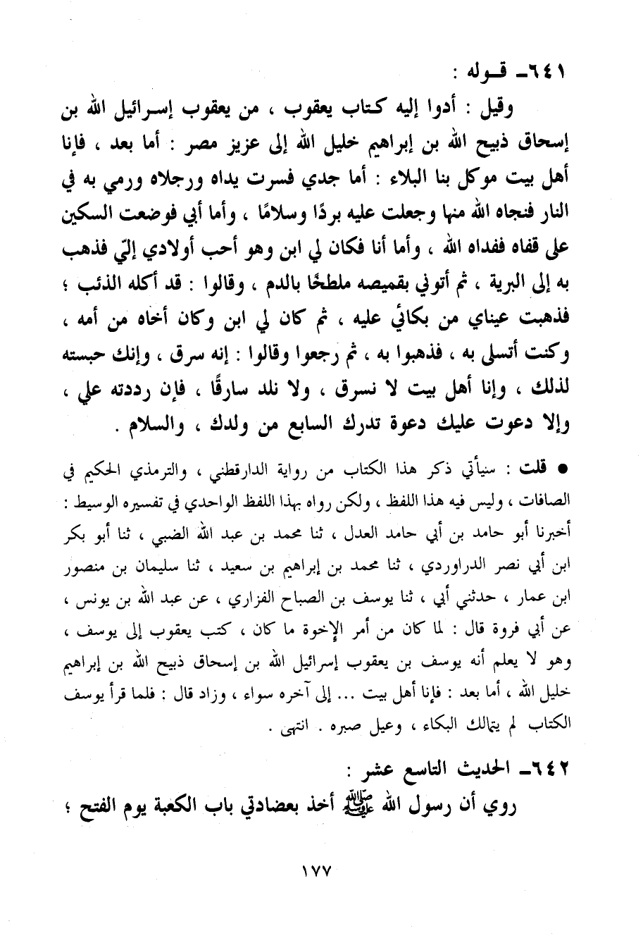 641 - قَوْله وَقيل أَدّوا إِلَيْهِ كتاب يَعْقُوب من يَعْقُوب إِسْرَائِيل الله بن إِسْحَاق ذبيح الله بن إِبْرَاهِيم خَلِيل الله إِلَى عَزِيز مصر أما بعد فَإنَّا أهل بَيت مُوكل بِنَا الْبلَاء أما جدي فسرت يَدَاهُ وَرجلَاهُ وَرمي بِهِ فِي النَّار فَنَجَّاهُ الله مِنْهَا وَجعلت عَلَيْهِ بردا وَسلَامًا وَأما أبي فَوضعت السكين عل قَفاهُ فَفَدَاهُ الله وَأما أَنا فَكَانَ لي ابْن وَهُوَ أحب أَوْلَادِي إِلَيّ فَذهب بِهِ إِلَى الْبَريَّة ثمَّ أَتَوْنِي بِقَمِيصِهِ مُلَطَّخًا بِالدَّمِ وَقَالُوا قد أكله الذِّئْب فَذَهَبت عَيْنَايَ من بُكَائِي عَلَيْهِ ثمَّ كَانَ لي ابْن وَكَانَ أَخَاهُ من أمه وَكنت أَتَسَلَّى بِهِ فَذَهَبُوا بِهِ ثمَّ رجعُوا وَقَالُوا إِنَّه سرق وَإنَّك حَبسته لذَلِك وَإِنَّا أهل بَيت لَا نَسْرِق وَلَا نَلِد سَارِقا فَإِن رَددته عَلّي وَإِلَّا دَعَوْت عَلَيْك دَعْوَة تدْرك السَّابِع من ولدك وَالسَّلَام