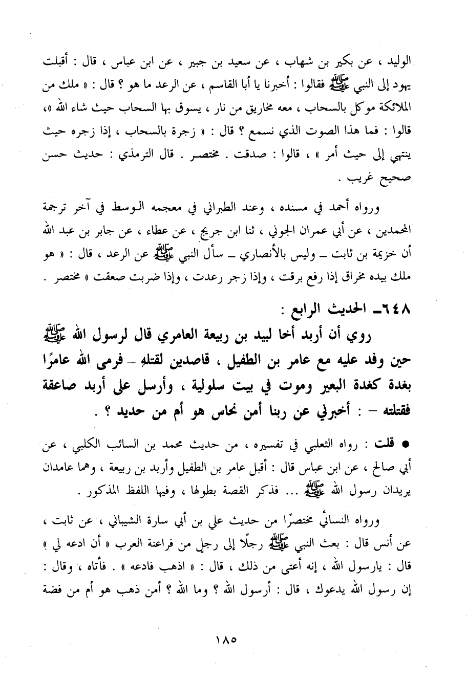 الْوَلِيد عَن بكير بن شهَاب عَن سعيد بن جُبَير عَن ابْن عَبَّاس قَالَ أَقبلت يهود إِلَى النَّبِي صَلَّى اللَّهُ عَلَيْهِ وَسَلَّم َ فَقَالُوا أخبرنَا يَا أَبَا الْقَاسِم عَن الرَّعْد مَا هُوَ قَالَ (ملك من الْمَلَائِكَة مُوكل بالسحاب مَعَه مخاريق من نَار يَسُوق بهَا السَّحَاب حَيْثُ شَاءَ الله) قَالُوا فَمَا هَذَا الصَّوْت الَّذِي نسْمع قَالَ (زَجْرَة بالسحاب إِذا زَجره حَيْثُ يَنْتَهِي إِلَى حَيْثُ أَمر) قَالُوا صدقت