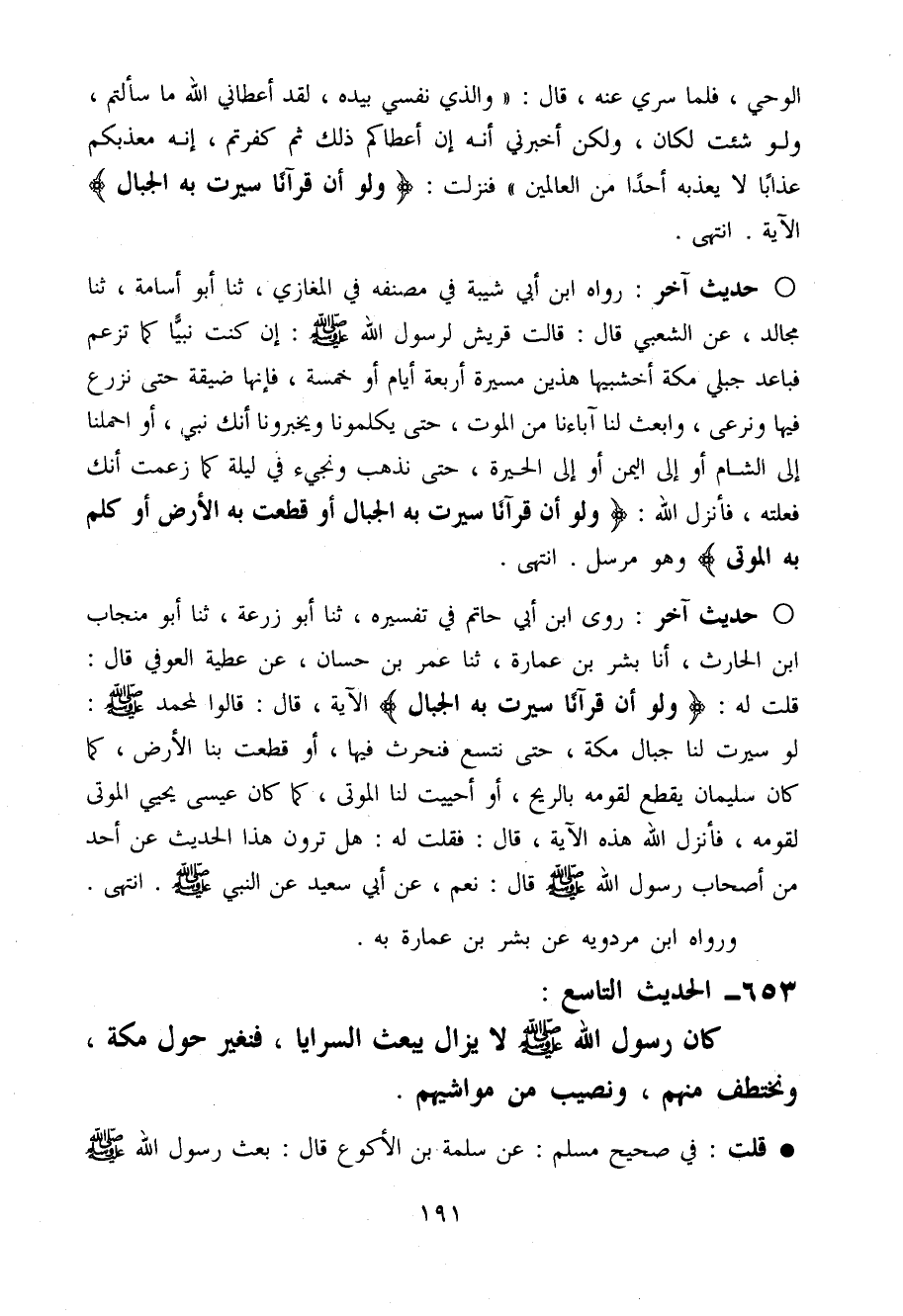 حَدِيث آخر رَوَاهُ ابْن أبي شيبَة فِي مُصَنفه فِي الْمَغَازِي حَدثنَا أَبُو أُسَامَة حَدثنَا مجَالد عَن الشّعبِيّ قَالَ قَالَت قُرَيْش لرَسُول الله صَلَّى اللَّهُ عَلَيْهِ وَسَلَّم َ إِن كنت نَبيا كَمَا تزْعم فباعد جبلي مَكَّة أخشبيها هذَيْن مسيرَة أَرْبَعَة أَيَّام أَو خَمْسَة فَإِنَّهَا ضيقَة حَتَّى نَزْرَع فِيهَا وَنَرْعَى وَابعث لنا آبَاءَنَا من الْمَوْت حَتَّى يُكَلِّمُونَا وَيُخْبِرُونَا أَنَّك نَبِي أَو احْمِلْنَا إِلَى الشَّام أَو إِلَى الْيمن أَو إِلَى الْحيرَة حَتَّى نَذْهَب وَنَجِيء فِي لَيْلَة كَمَا زعمت أَنَّك فعلته فَأنْزل الله وَلَو أَن قُرْآنًا سيرت بِهِ الْجبَال أَو قطعت بِهِ الأَرْض أَو كلم بِهِ الْمَوْتَى وَهُوَ مُرْسل