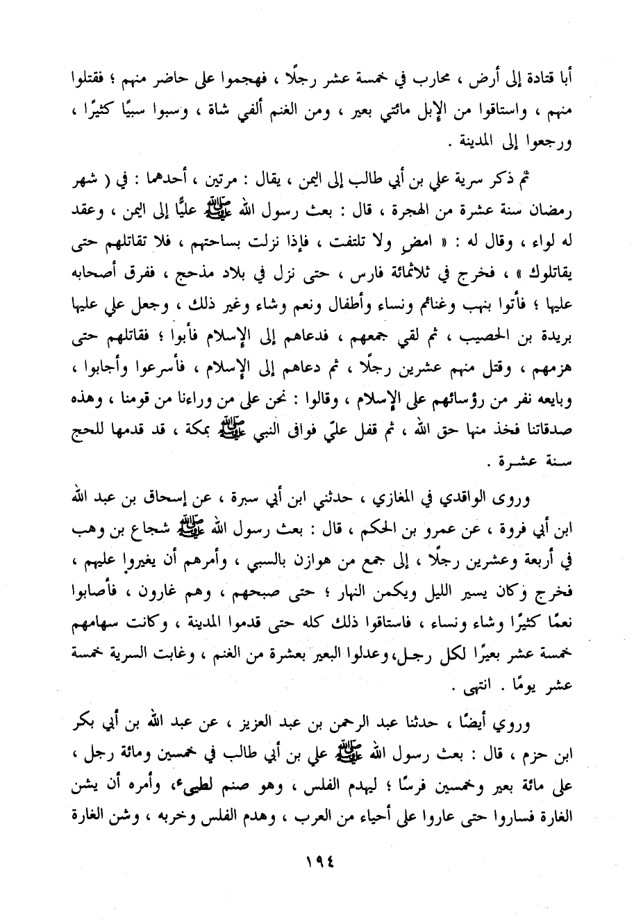 وَرُوِيَ أَيْضا حَدثنَا عبد الرَّحْمَن بن عبد الْعَزِيز عَن عبد الله بن أبي بكر ابْن حزم قَالَ بعث رَسُول الله صَلَّى اللَّهُ عَلَيْهِ وَسَلَّم َ عَلّي بن أبي طَالب فِي خمسين وَمِائَة رجل عَلَى مائَة بعير وَخمسين فرسا ليهْدم الْفلس وَهُوَ صنم لِطَيِّئٍ وَأمره أَن يَشن الْغَارة فَسَارُوا حَتَّى غاروا عَلَى أَحيَاء من الْعَرَب وَهدم الْفلس وَخَرَّبَهُ وَشن الْغَارة