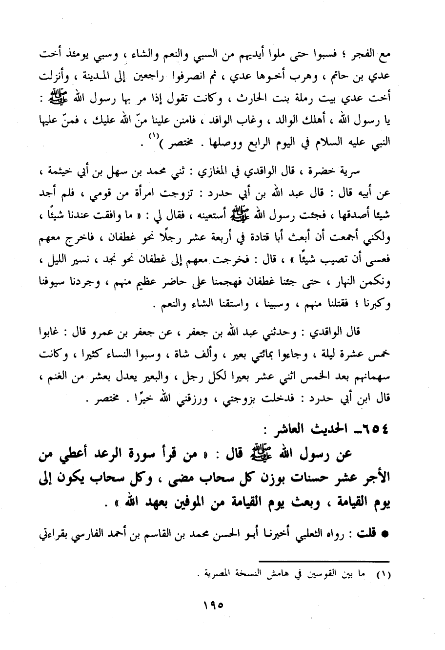 مَعَ الْفجْر فَسبوا حَتَّى ملوا أَيْديهم من السَّبي وَالنعَم وَالشَّاء وَسبي يَوْمئِذٍ أُخْت عدي بن حَاتِم وهرب أَخُوهَا عدي ثمَّ انصرفوا رَاجِعين إِلَى الْمَدِينَة وأنزلت أُخْت عدي بَيت رَملَة بنت الْحَارِث وَكَانَت تَقول إِذا مر بهَا رَسُول الله صَلَّى اللَّهُ عَلَيْهِ وَسَلَّم َ يَا رَسُول الله أهلك الْوَالِد وَغَابَ الْوَافِد فَامْنُنْ علينا من الله عَلَيْك فَمن النَّبِي عَلَيْهِ الصَّلَاة وَالسَّلَامُ فِي الْيَوْم الرَّابِع وَوَصلهَا