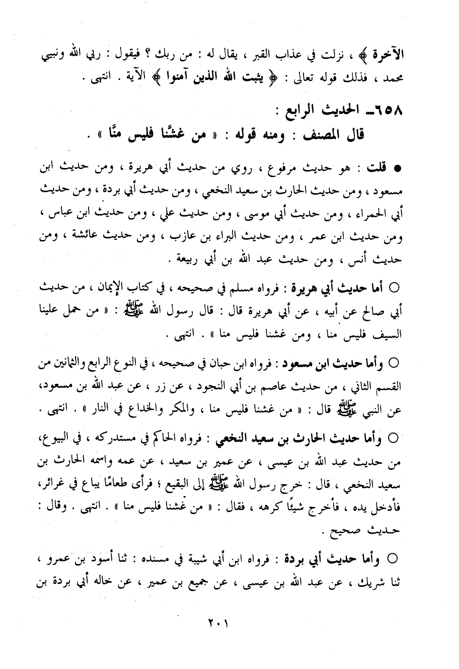 658 - الحَدِيث الرَّابِع قَالَ المُصَنّف وَمِنْه قَوْله (من غَشنَا فَلَيْسَ منا)