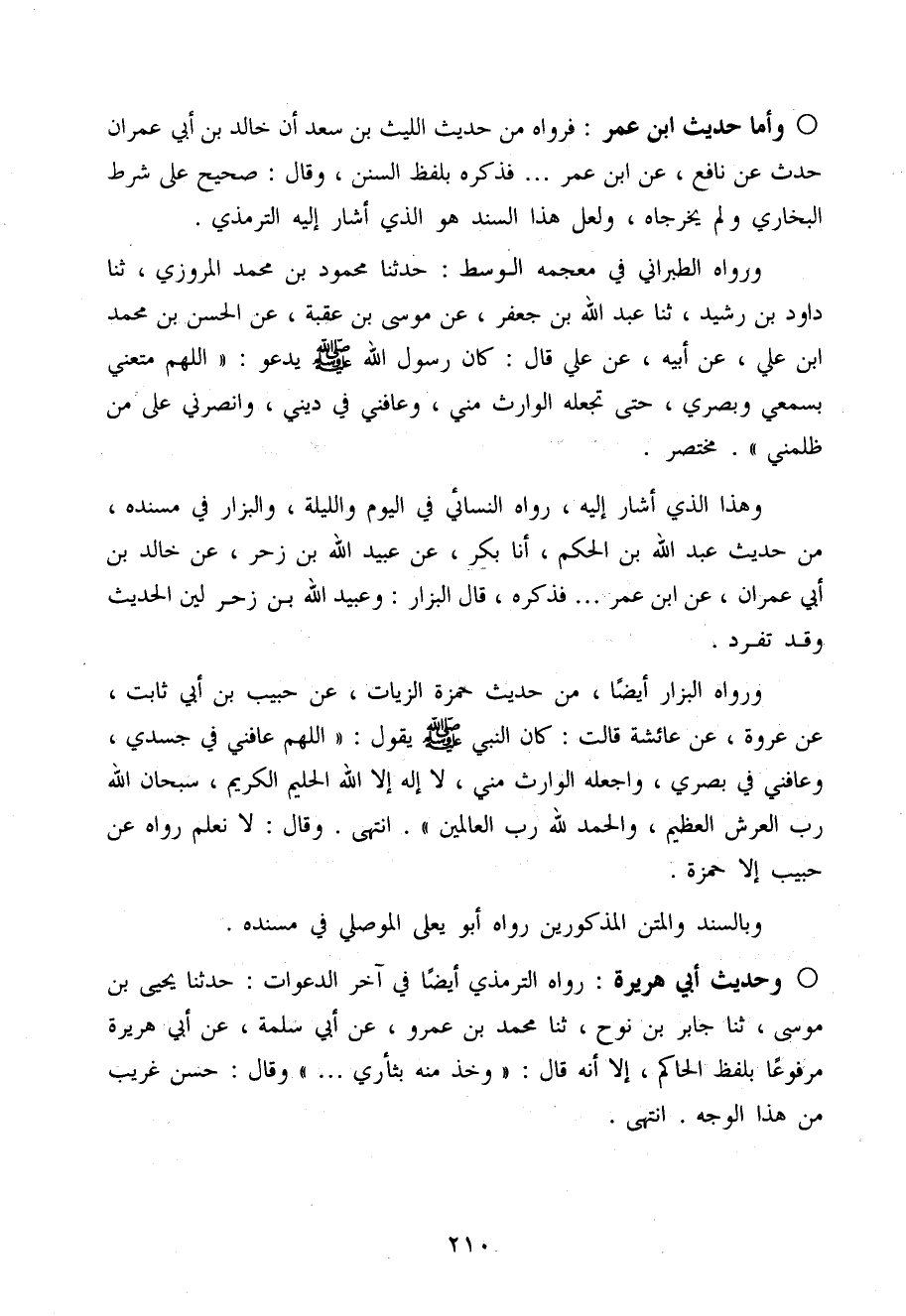 وَرَوَاهُ الطَّبَرَانِيّ فِي مُعْجَمه الْوسط حَدثنَا مَحْمُود بن مُحَمَّد الْمروزِي حَدثنَا دَاوُد بن رشيد حَدثنَا عبد الله بن جَعْفَر عَن مُوسَى بن عقبَة عَن الْحسن بن مُحَمَّد ابْن عَلّي عَن أَبِيه عَن عَلّي قَالَ كَانَ رَسُول الله صَلَّى اللَّهُ عَلَيْهِ وَسَلَّم َ يَدْعُو (اللَّهُمَّ متعني بسمعي وبصري حَتَّى تَجْعَلهُ الْوَارِث مني وَعَافنِي فِي ديني وَانْصُرْنِي عَلَى من ظَلَمَنِي)