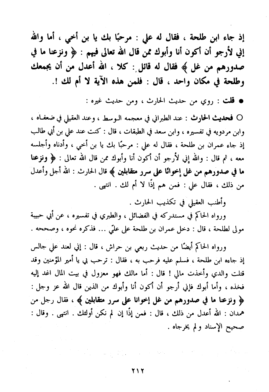 فَحَدِيث الْحَارِث عِنْد الطَّبَرَانِيّ فِي مُعْجَمه الْوسط وَعند الْعقيلِيّ فِي ضعفَاهُ وَابْن مرْدَوَيْه فِي تَفْسِيره وَابْن سعد فِي الطَّبَقَات قَالَ كنت عِنْد عَلّي بن أبي طَالب إِذْ جَاءَ عمرَان بن طَلْحَة فَقَالَ لَهُ عَلّي مرْحَبًا بك يَا ابْن أخي وَأَدْنَاهُ وَأَجْلسهُ مَعَه ثمَّ قَالَ وَالله إِنِّي لأرجو أَن أكون أَنا وَأَبُوك مِمَّن قَالَ الله تَعَالَى وَنَزَعْنَا مَا فِي صُدُورهمْ من غل إخْوَانًا عَلَى سرر مُتَقَابلين قَالَ الْحَارِث الله أجل وَأَعْدل من ذَلِك فَقَالَ عَلّي فَمن هم إِذا لَا أم لَك
