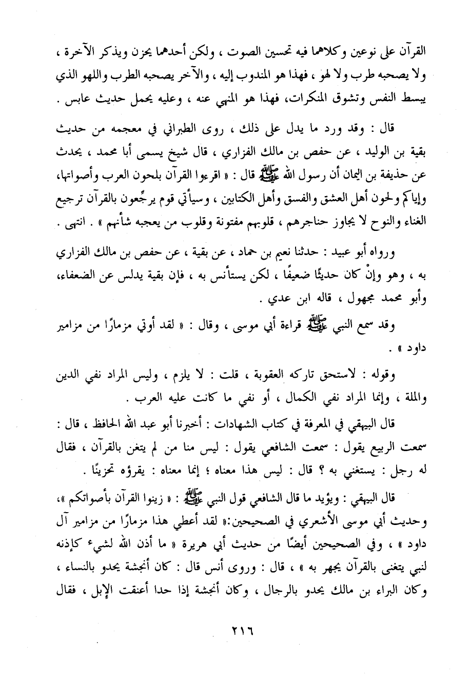 قَالَ الْبَيْهَقِيّ وَيُؤَيّد مَا قَالَ الشَّافِعِي قَول النَّبِي صَلَّى اللَّهُ عَلَيْهِ وَسَلَّم َ (زَينُوا الْقُرْآن بِأَصْوَاتِكُمْ) وَحَدِيث أبي مُوسَى الْأَشْعَرِيّ فِي الصَّحِيحَيْنِ (لقد أعطي هَذَا مِزْمَارًا من مَزَامِير آل وَفِي الصَّحِيحَيْنِ أَيْضا من حَدِيث أبي هُرَيْرَة مَا أذن الله لشَيْء كَإِذْنِهِ لنَبِيّ يتَغَنَّى بِالْقُرْآنِ يجْهر بِهِ قَالَ وَرَوَى أنس قَالَ كَانَ أَنْجَشَة يَحْدُو بِالنسَاء وَكَانَ الْبَراء بن مَالك يَحْدُو بِالرِّجَالِ وَكَانَ أَنْجَشَة إِذا حدا أَعْنَقت الْإِبِل فَقَالَ