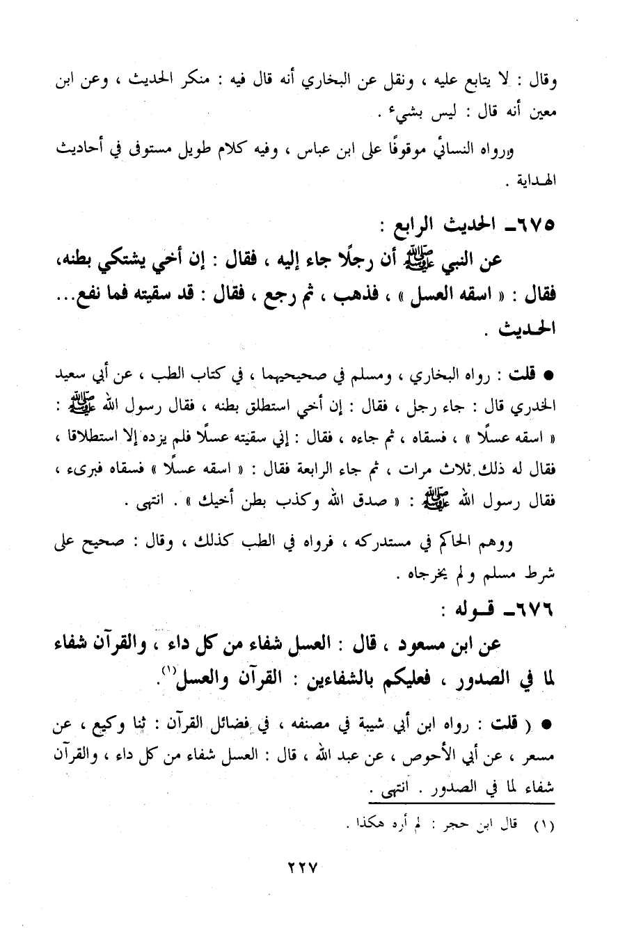 676 - قَوْله عَن ابْن مَسْعُود قَالَ الْعَسَل شِفَاء من كل دَاء وَالْقُرْآن شِفَاء لما فِي الصُّدُور فَعَلَيْكُم بِالشِّفَاءَيْنِ الْعَسَل وَالْقُرْآن