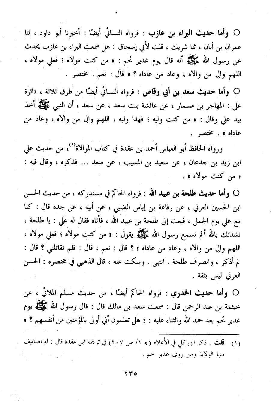 وَأما حَدِيث طَلْحَة بن عبيد الله فَرَوَاهُ الْحَاكِم فِي مُسْتَدْركه من حَدِيث الْحسن ابْن الْحُسَيْن العرني عَن رِفَاعَة بن إِيَاس الضَّبِّيّ عَن أَبِيه عَن جده قَالَ كُنَّا مَعَ عَلّي يَوْم الْجمل فَبعث إِلَى طَلْحَة بن عبيد الله فَأَتَاهُ فَقَالَ لَهُ عَلّي يَا طَلْحَة نشدتك بِاللَّه ألم تسمع رَسُول الله صَلَّى اللَّهُ عَلَيْهِ وَسَلَّم َ يَقُول (من كنت مَوْلَاهُ فعلي مَوْلَاهُ اللَّهُمَّ وَال من وَالَاهُ وَعَاد من عَادَاهُ) قَالَ نعم قَالَ فَلم تُقَاتِلنِي قَالَ لم أذكر وَانْصَرف طَلْحَة