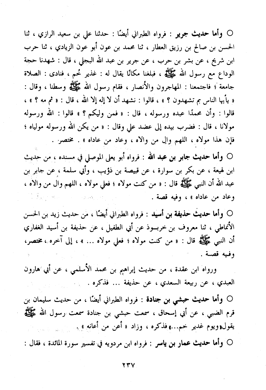 وَأما حَدِيث جرير فَرَوَاهُ الطَّبَرَانِيّ أَيْضا حَدثنَا عَلّي بن سعيد الرَّازِيّ حَدثنَا الْحسن بن صَالح بن زُرَيْق الْعَطَّار حَدثنَا مُحَمَّد بن عون أَبُو عون الزيَادي حَدثنَا حَرْب ابْن شُرَيْح عَن بشر بن حَرْب عَن جرير عبد الله البَجلِيّ قَالَ شَهِدنَا حجَّة الْوَدَاع مَعَ رَسُول الله صَلَّى اللَّهُ عَلَيْهِ وَسَلَّم َ فَبَلغنَا مَكَانا يُقَال لَهُ غَدِير خم فَنَادَى الصَّلَاة جَامِعَة فَاجْتَمَعْنَا الْمُهَاجِرُونَ وَالْأَنْصَار فَقَامَ رَسُول الله صَلَّى اللَّهُ عَلَيْهِ وَسَلَّم َ وَسطنَا وَقَالَ (يأيها النَّاس بِمَ تَشْهَدُون) قَالُوا نشْهد أَن لَا إِلَه إِلَّا الله قَالَ (ثمَّ مَه) قَالُوا وَأَن مُحَمَّدًا عَبده وَرَسُوله قَالَ فَمن وَلِيكُم قَالُوا الله وَرَسُوله مَوْلَانَا قَالَ فَضرب بِيَدِهِ إِلَى عضد عَلّي وَقَالَ (من يكن الله وَرَسُوله موليَاهُ فَإِن هَذَا مَوْلَاهُ اللَّهُمَّ وَال من وَالَاهُ وَعَاد من عَادَاهُ