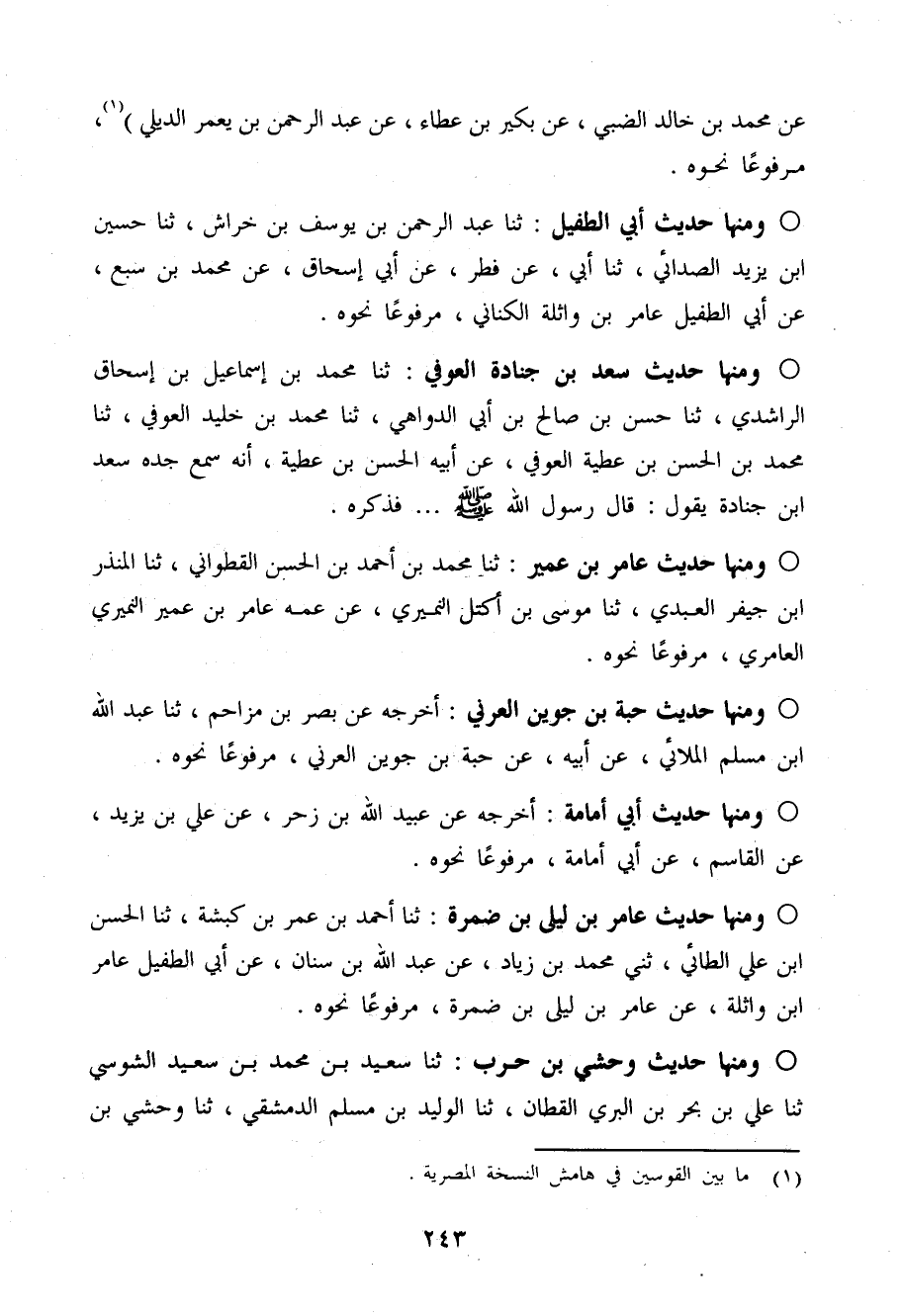 وَمِنْهَا حَدِيث أبي الطُّفَيْل حَدثنَا عبد الرَّحْمَن بن يُوسُف بن خرَاش حَدثنَا حُسَيْن ابْن يزِيد الصدائي حَدثنَا أبي عَن فطر عَن أبي إِسْحَاق عَن مُحَمَّد بن سبع عَن أبي الطُّفَيْل عَامر بن وَاثِلَة الْكِنَانِي مَرْفُوعا نَحوه