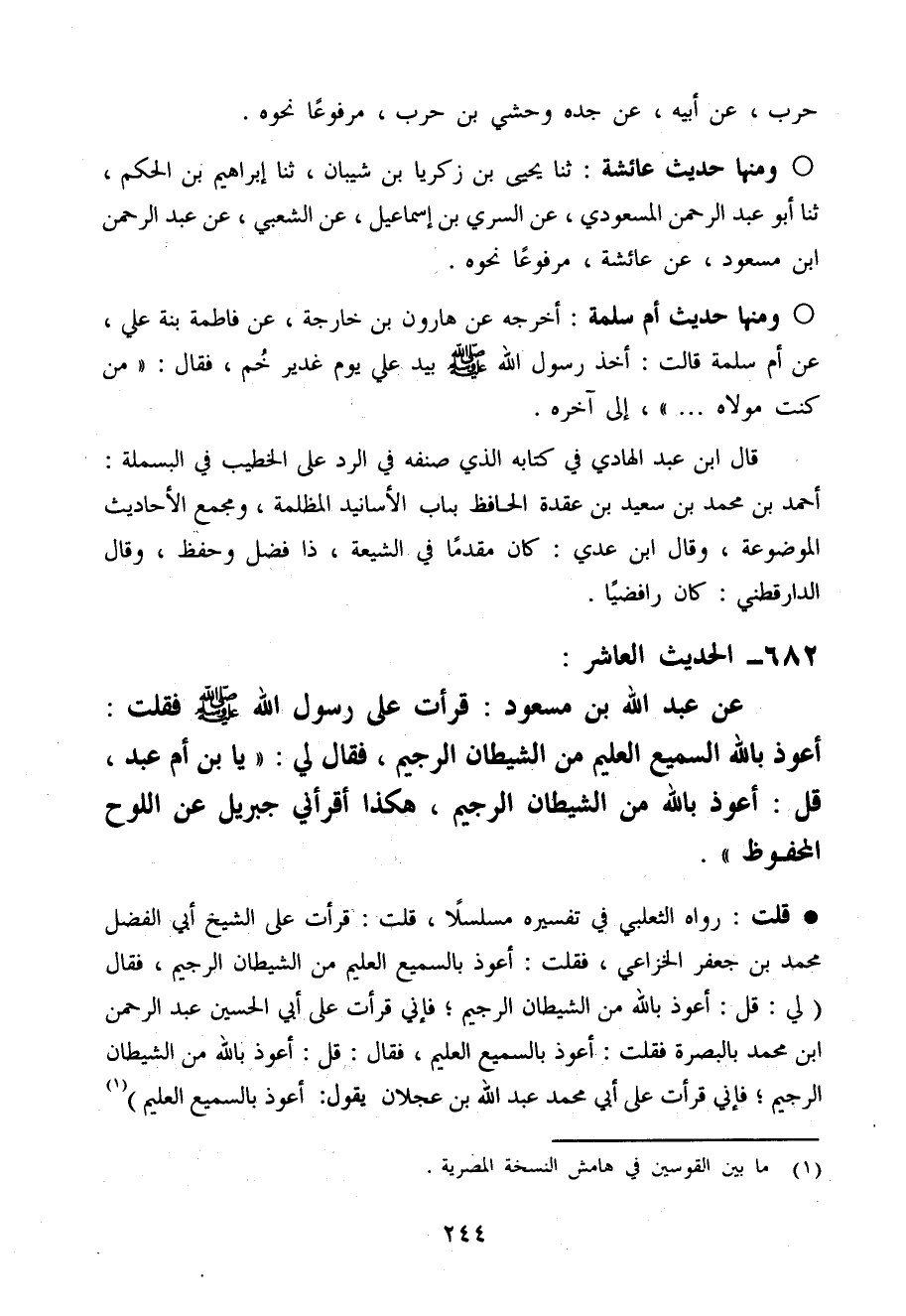 عَن عبد الله بن مَسْعُود قَرَأت عَلَى رَسُول الله صَلَّى اللَّهُ عَلَيْهِ وَسَلَّم َ فَقلت أعوذ بِاللَّه السَّمِيع الْعَلِيم من الشَّيْطَان الرَّجِيم فَقَالَ لي يَا بن أم عبد قل أعوذ بِاللَّه من الشَّيْطَان الرَّجِيم هَكَذَا أَقْرَأَنِي جِبْرِيل عَن اللَّوْح الْمَحْفُوظ)