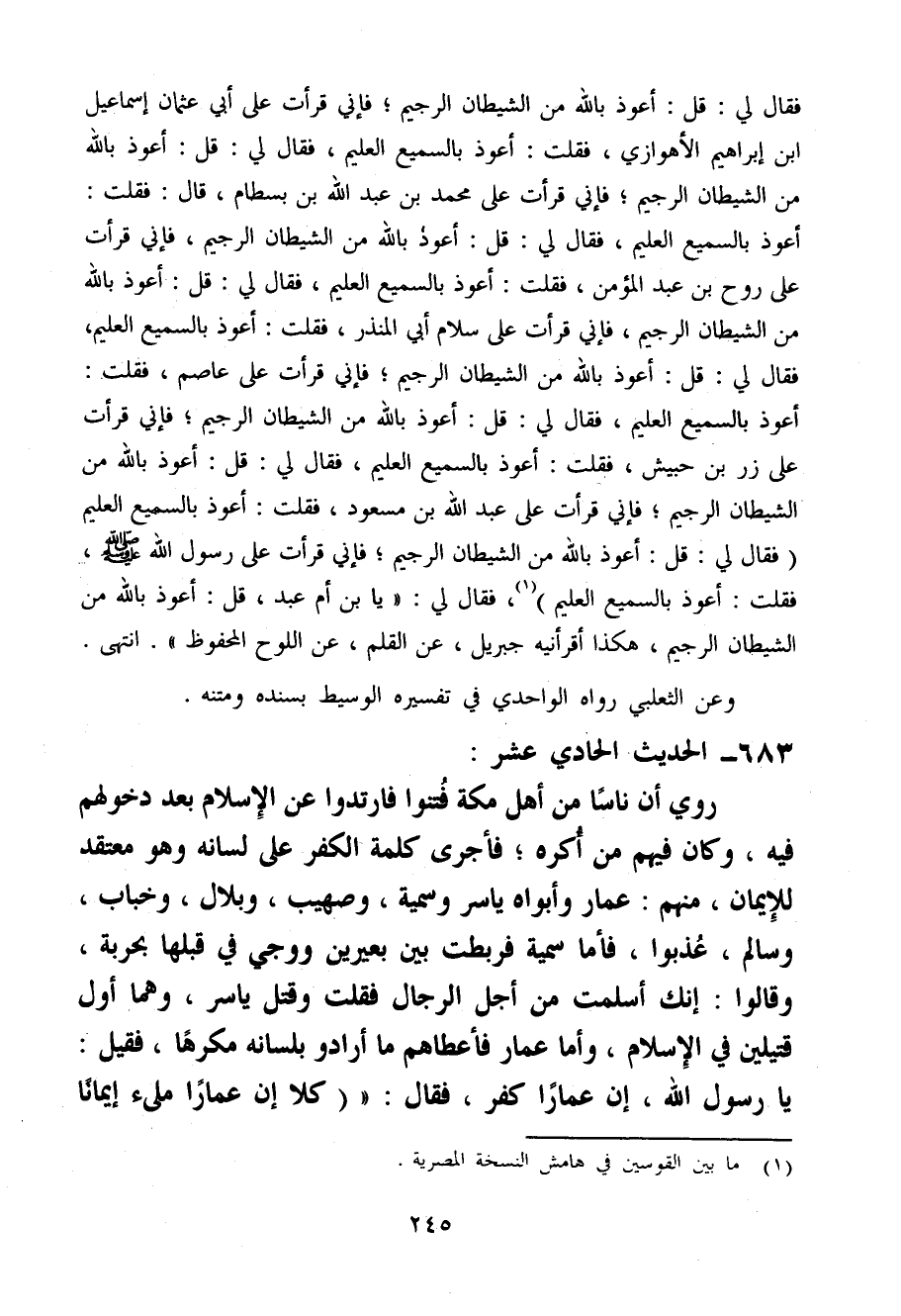 قَالَ لي قل أعوذ بِاللَّه من الشَّيْطَان الرَّجِيم فَإِنِّي قَرَأت عَلَى أبي عُثْمَان إِسْمَاعِيل ابْن إِبْرَاهِيم الْأَهْوَازِي فَقلت أعوذ بالسميع الْعَلِيم فَقَالَ لي قل أعوذ بِاللَّه من الشَّيْطَان الرَّجِيم فَإِنِّي قَرَأت عَلَى مُحَمَّد بن عبد الله بن بسطَام قَالَ فَقلت أعوذ بالسميع الْعَلِيم فَقَالَ لي قل أعوذ بِاللَّه من الشَّيْطَان الرَّجِيم فَإِنِّي قَرَأت عَلَى روح بن عبد الْمُؤمن فَقلت أعوذ بالسميع الْعَلِيم فَقَالَ لي قل أعوذ بِاللَّه من الشَّيْطَان الرَّجِيم فَإِنِّي قَرَأت عَلَى سَلام أبي الْمُنْذر فَقلت أعوذ بالسميع الْعَلِيم فَقَالَ لي قل أعوذ بِاللَّه من الشَّيْطَان الرَّجِيم فَإِنِّي قَرَأت عَلَى عَاصِم فَقلت أعوذ بالسميع الْعَلِيم فَقَالَ لي قل أعوذ بِاللَّه من الشَّيْطَان الرَّجِيم فَإِنِّي قَرَأت عَلَى زر بن حُبَيْش فَقلت أعوذ بالسميع الْعَلِيم فَقَالَ لي قل أعوذ بِاللَّه من الشَّيْطَان الرَّجِيم فَأَنِّي قَرَأت عَلَى عبد الله بن مَسْعُود فَقلت أعوذ بالسميع الْعَلِيم فَقَالَ لي قل أعوذ بِاللَّه من الشَّيْطَان الرَّجِيم فَأَنِّي قَرَأت عَلَى رَسُول الله صَلَّى اللَّهُ عَلَيْهِ وَسَلَّم َ فَقلت أعوذ بِالسَّمْعِ الْعَلِيم فَقَالَ لي (يَا بن أم عبد قل أعوذ بِاللَّه من الشَّيْطَان الرَّجِيم هَكَذَا أَقْرَأَنِيهِ جِبْرِيل عَن الْقَلَم عَن اللَّوْح الْمَحْفُوظ)