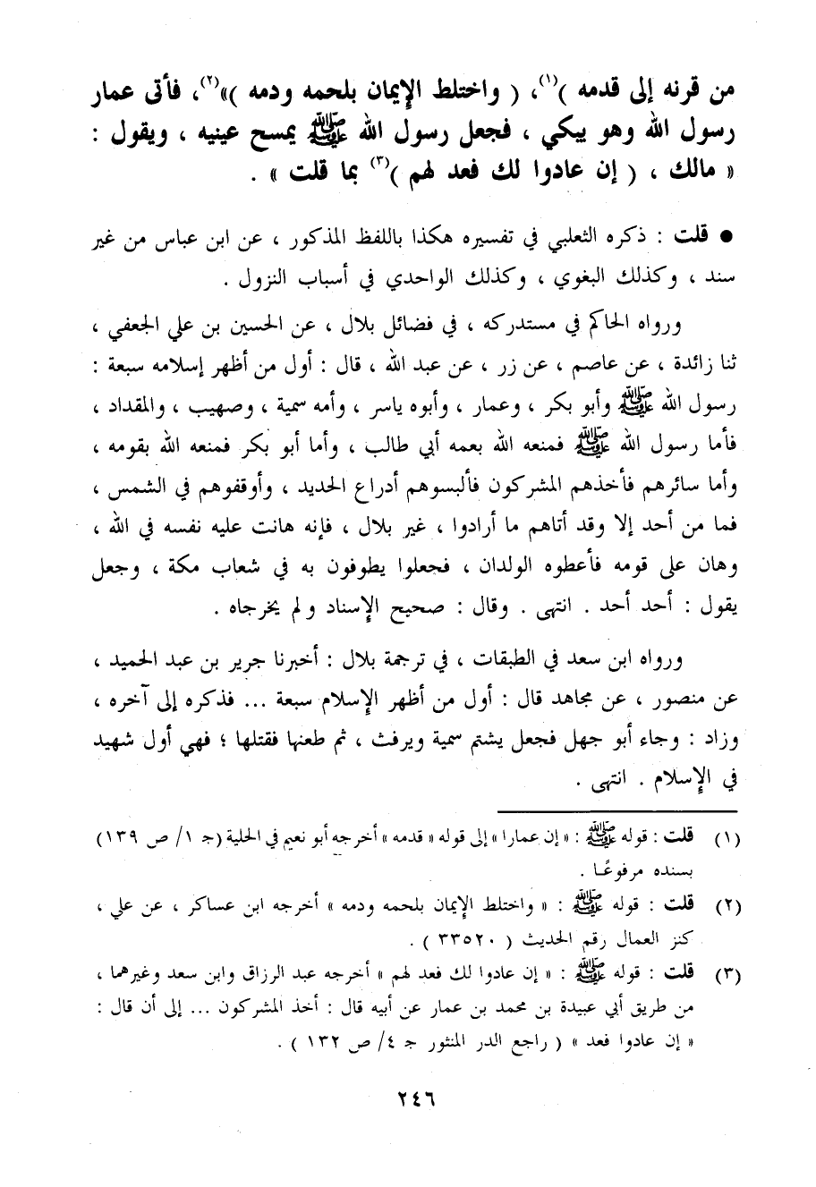 من قرنه إِلَى قدمه وَاخْتَلَطَ الْإِيمَان بِلَحْمِهِ وَدَمه) فَأَتَى عمار رَسُول الله وَهُوَ يبكي فَجعل رَسُول الله صَلَّى اللَّهُ عَلَيْهِ وَسَلَّم َ يمسح عَيْنَيْهِ وَيَقُول (مَالك إِن عَادوا لَك فعد لَهُم بِمَا قلت)
