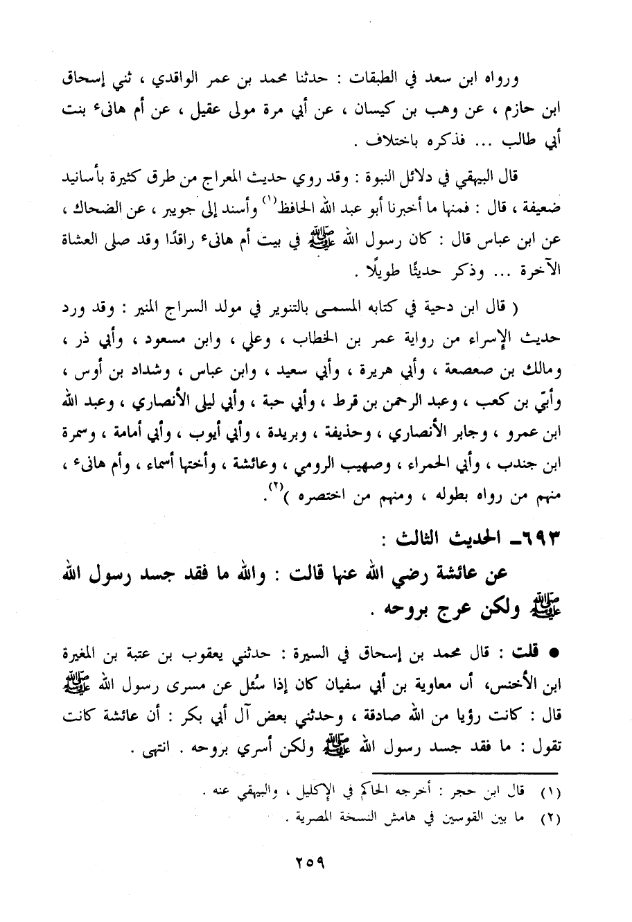 قَالَ الْبَيْهَقِيّ فِي دَلَائِل النُّبُوَّة وَقد رُوِيَ حَدِيث الْمِعْرَاج من طرق كَثِيرَة بأسانيد ضَعِيفَة قَالَ فَمِنْهَا مَا أخبرنَا أَبُو عبد الله الْحَافِظ وَأسْندَ إِلَى جُوَيْبِر عَن الضَّحَّاك عَن ابْن عَبَّاس قَالَ كَانَ رَسُول الله صَلَّى اللَّهُ عَلَيْهِ وَسَلَّم َ فِي بَيت أم هَانِئ رَاقِدًا وَقد صَلَّى الْعشَاء الْآخِرَة ... وَذكر حَدِيثا طَويلا