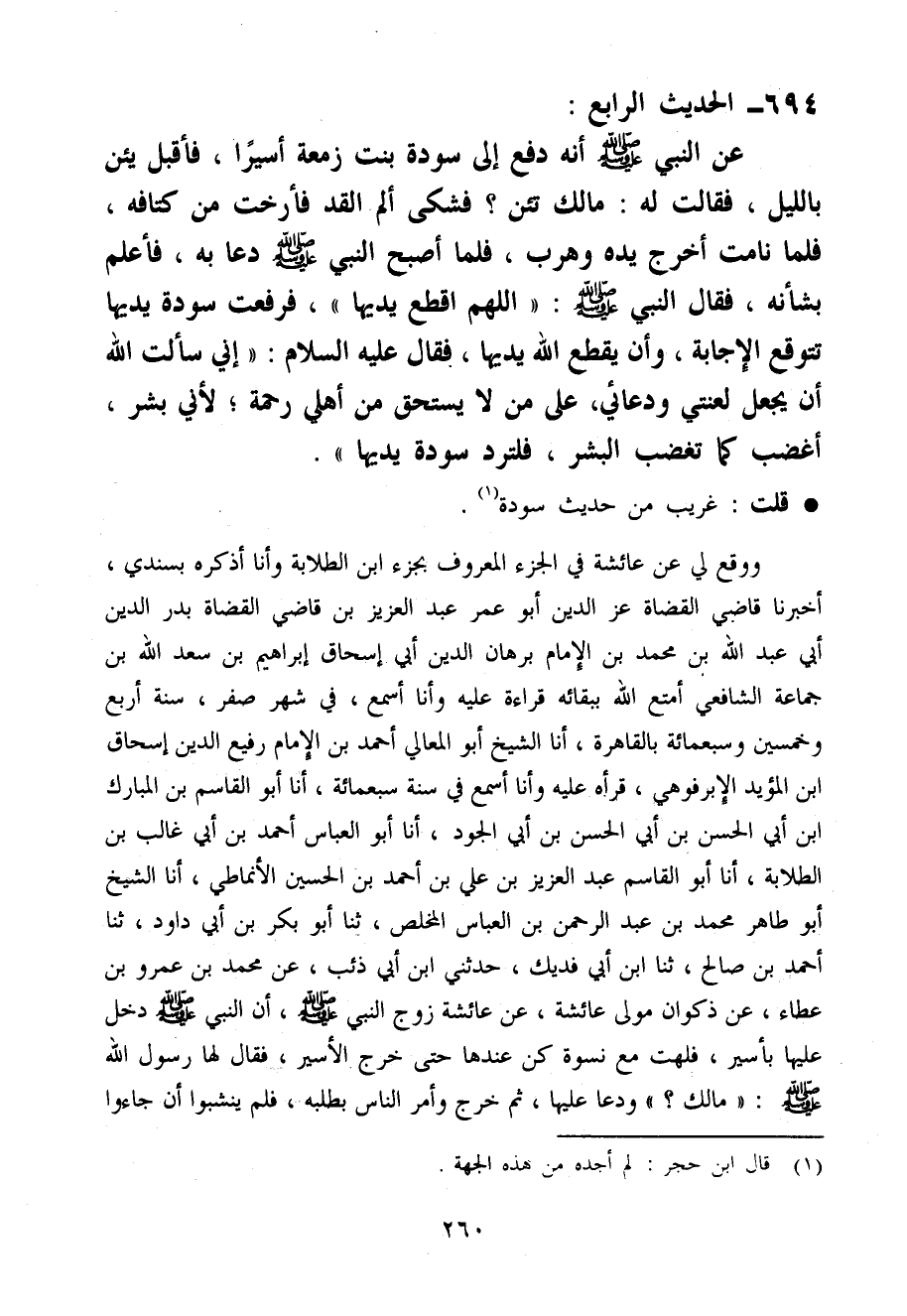 وَوَقع لي عَن عَائِشَة فِي الْجُزْء الْمَعْرُوف بِجُزْء ابْن الطلابة وَأَنا أذكرهُ بسندي أخبرنَا قَاضِي الْقُضَاة عز الدَّين أَبُو عمر عبد الْعَزِيز ابْن قَاضِي الْقُضَاة بدر الدَّين أبي عبد الله بن مُحَمَّد بن الإِمَام برهَان الدَّين أبي إِسْحَاق إِبْرَاهِيم بن سعد الله بن جمَاعَة الشَّافِعِي أمتع الله بِبَقَائِهِ قِرَاءَة عَلَيْهِ وَأَنا أسمع فِي شهر صفر سنة أَربع وَخمسين وَسَبْعمائة بِالْقَاهِرَةِ أَنا الشَّيْخ أَبُو الْمَعَالِي أَحْمد بن الإِمَام رفيع الدَّين إِسْحَاق ابْن الْمُؤَيد الإبرفوهي قَرَأَهُ عَلَيْهِ وَأَنا أسمع فِي سنة سَبْعمِائة أَنا أَبُو الْقَاسِم بن الْمُبَارك ابْن أبي الْحسن بن أبي الْحسن بن أبي الْجُود أَنا أَبُو الْعَبَّاس أَحْمد بن أبي غَالب بن الطلابة أَنا أَبُو الْقَاسِم عبد الْعَزِيز بن عَلّي بن أَحْمد بن الْحُسَيْن الْأنمَاطِي أَنا الشَّيْخ أَبُو طَاهِر مُحَمَّد بن عبد الرَّحْمَن بن الْعَبَّاس المخلص حَدثنَا أَبُو بكر بن أبي دَاوُد حَدثنَا أَحْمد بن صَالح حَدثنَا ابْن أبي فديك حَدثنِي ابْن أبي ذِئْب عَن مُحَمَّد بن عَمْرو بن عَطاء عَن ذكْوَان مولَى عَائِشَة عَن عَائِشَة زوج النَّبِي صَلَّى اللَّهُ عَلَيْهِ وَسَلَّم َ أَن النَّبِي صَلَّى اللَّهُ عَلَيْهِ وَسَلَّم َ دخل عَلَيْهَا بأسير فَلَهَتْ مَعَ نسْوَة كن عِنْدهَا حَتَّى خرج الْأَسير فَقَالَ لَهَا رَسُول الله صَلَّى اللَّهُ عَلَيْهِ وَسَلَّم َ (مَالك) ودعا عَلَيْهَا ثمَّ خرج وَأمر النَّاس بِطَلَبِهِ فَلم يَنْشَبُوا أَن جَاءُوا