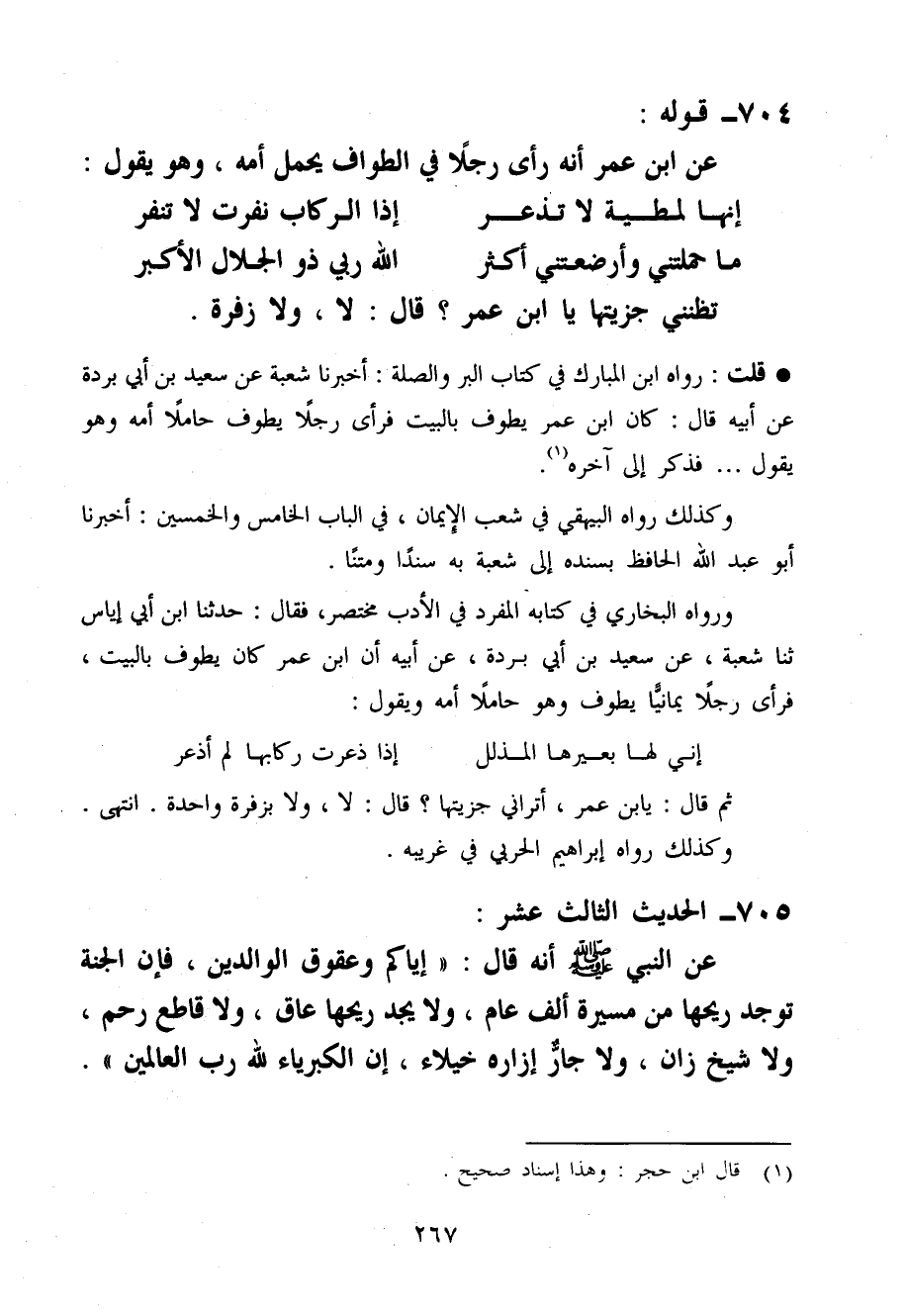 704 - قَوْله عَن ابْن عمر أَنه رَأَى رجلا فِي الطّواف يحمل أمه وَهُوَ يَقُول