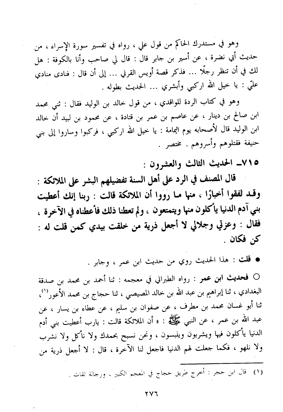 قَالَ المُصَنّف فِي الرَّد عَلَى أهل السّنة تَفْضِيلهمْ الْبشر عَلَى الْمَلَائِكَة وَقد لَفَظُوا أَخْبَارًا مِنْهَا مَا رووا أَن الْمَلَائِكَة قَالَت رَبنَا إِنَّك أَعْطَيْت بني آدم الدُّنْيَا يَأْكُلُون مِنْهَا ويتمتعون وَلم تُعْطِنَا ذَلِك فَأَعْطِنَاهُ فِي الْآخِرَة فَقَالَ وَعِزَّتِي وَجَلَالِي لَا أجعَل ذُرِّيَّة من خلقت بيَدي كمن قلت لَهُ كن فَكَانَ