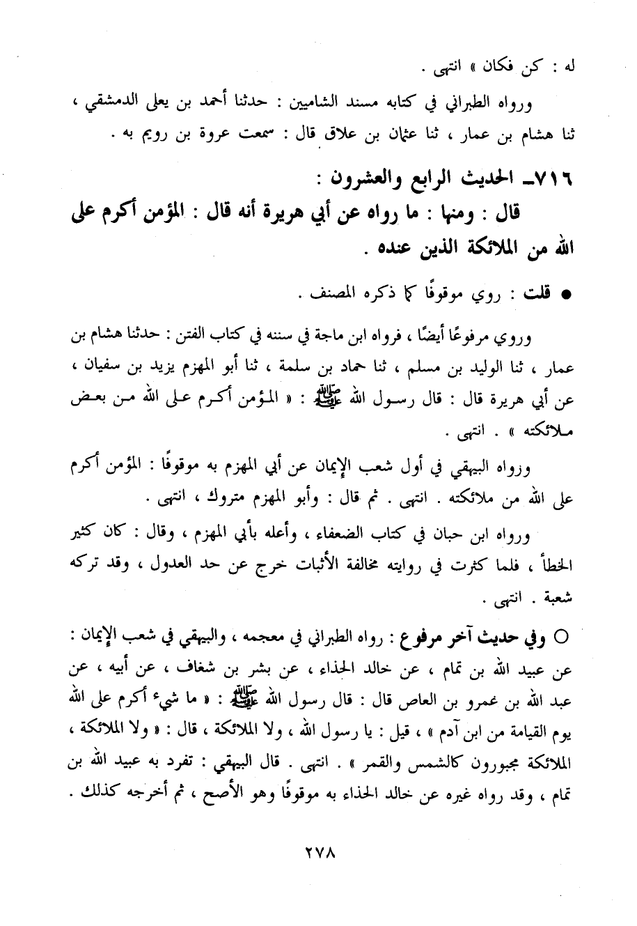 وَرُوِيَ مَرْفُوعا أَيْضا فَرَوَاهُ ابْن ماجة فِي سنَنه فِي كتاب الْفِتَن حَدثنَا هِشَام بن عمار حَدثنَا الْوَلِيد بن مُسلم حَدثنَا حَمَّاد بن سَلمَة حَدثنَا أَبُو المهزم يزِيد بن سُفْيَان عَن أبي هُرَيْرَة قَالَ قَالَ رَسُول الله صَلَّى اللَّهُ عَلَيْهِ وَسَلَّم َ (الْمُؤمن أكْرم عَلَى الله من بعض مَلَائكَته)