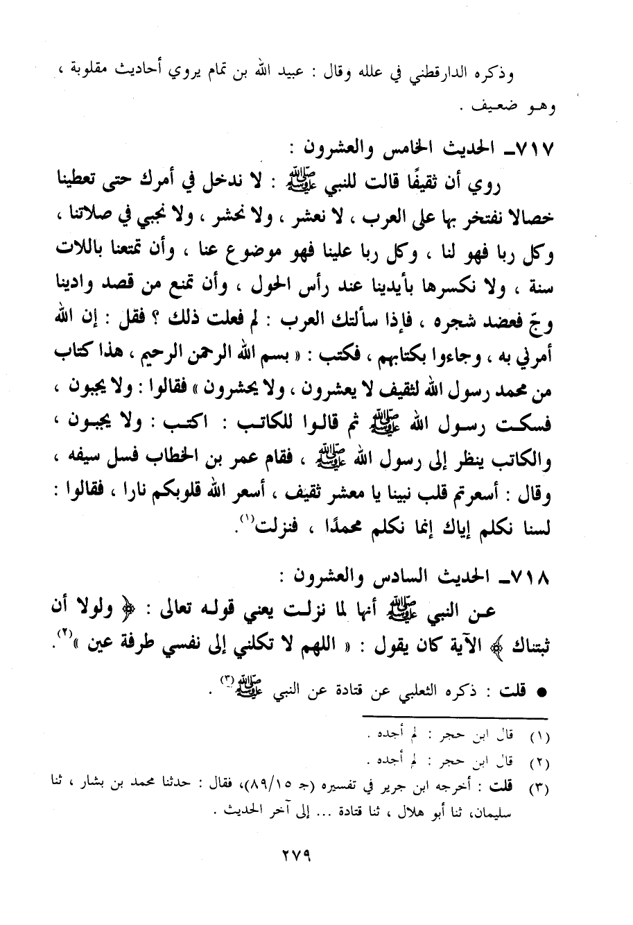 رُوِيَ أَن ثقيفا قَالَت للنَّبِي صَلَّى اللَّهُ عَلَيْهِ وَسَلَّم َ لَا ندخل فِي أَمرك حَتَّى تُعْطِينَا خِصَالًا نفتخر بهَا عَلَى الْعَرَب لَا نَعْشِرُ وَلَا نحْشر وَلَا نجبي فِي صَلَاتنَا وكل رَبًّا فَهُوَ لنا وكل رَبًّا علينا فَهُوَ مَوْضُوع عَنَّا وَأَن تَمَتعنَا بِاللات سنة وَلَا نكسرها بِأَيْدِينَا عِنْد رَأس الْحول وَأَن تمنع من قصد وَادِينَا وَج فَعَضَدَ شَجَره فَإِذا سَأَلتك الْعَرَب لم فعلت ذَلِك فَقل إِن الله أَمرنِي بِهِ وَجَاءُوا بِكِتَابِهِمْ فَكتب (بِسم الله الرَّحْمَن الرَّحِيم هَذَا كتاب من مُحَمَّد رَسُول الله لثقيف لَا يعشرُونَ وَلَا يحشرون) فَقَالُوا وَلَا يجبونَ فَسكت رَسُول الله صَلَّى اللَّهُ عَلَيْهِ وَسَلَّم َ ثمَّ قَالُوا لِلْكَاتِبِ اكْتُبْ وَلَا يجبونَ وَالْكَاتِب ينظر إِلَى رَسُول الله صَلَّى اللَّهُ عَلَيْهِ وَسَلَّم َ فَقَامَ عمر بن الْخطاب فسل سَيْفه وَقَالَ أسعرتم قلب نَبينَا يَا معشر ثَقِيف أَسعر الله قُلُوبكُمْ نَارا فَقَالُوا لسنا نُكَلِّم إياك إِنَّمَا نُكَلِّم مُحَمَّدًا فَنزلت 718الحَدِيث السَّادِس وَالْعشْرُونَ