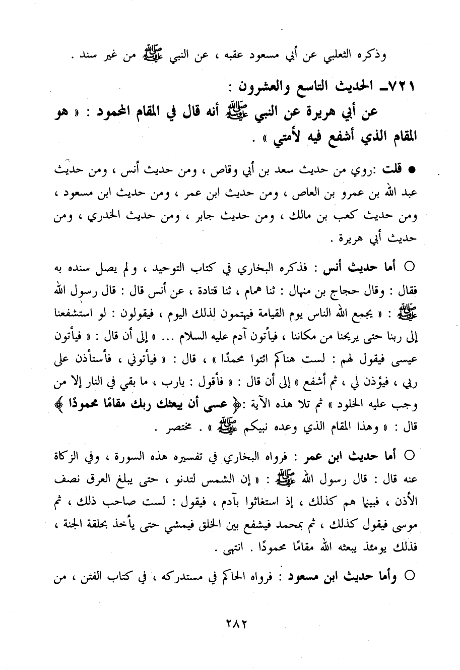 أما حَدِيث ابْن عمر فَرَوَاهُ البُخَارِيّ فِي تَفْسِيره هَذِه السُّورَة وَفِي الزَّكَاة عَنهُ قَالَ قَالَ رَسُول الله صَلَّى اللَّهُ عَلَيْهِ وَسَلَّم َ (إِن الشَّمْس لَتَدْنُو حَتَّى يبلغ الْعرق نصف الْأذن فَبَيْنَمَا هم كَذَلِك إِذْ اسْتَغَاثُوا بِآدَم فَيَقُول لست صَاحب ذَلِك ثمَّ مُوسَى فَيَقُول كَذَلِك ثمَّ بِمُحَمد فَيشفع بَين الْخلق فَيَمْشِي حَتَّى يَأْخُذ بِحَلقَة الْجنَّة فَذَلِك يَوْمئِذٍ يَبْعَثهُ الله مقَاما مَحْمُودًا