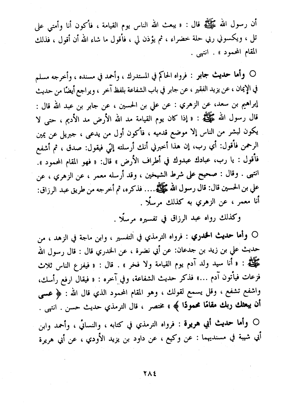أَن رَسُول الله صَلَّى اللَّهُ عَلَيْهِ وَسَلَّم َ قَالَ (يبْعَث الله النَّاس يَوْم الْقِيَامَة فَأَكُون أَنا وَأمتِي عَلَى تل وَيَكْسُونِي رَبِّي حلَّة خضراء ثمَّ يُؤذن لي فَأَقُول مَا شَاءَ الله أَن أَقُول فَذَلِك الْمقَام الْمَحْمُود)