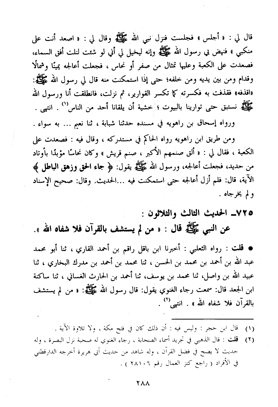 قلت رَوَاهُ الثَّعْلَبِيّ أخبرنَا ابْن بَاقِل رَاقِم بن أَحْمد الْقَارِي حَدثنَا أَبُو مُحَمَّد عبد الله بن أَحْمد بن مُحَمَّد بن الْحسن حَدثنَا مُحَمَّد بن أَحْمد بن مدرك البُخَارِيّ حَدثنَا عبيد الله بن وَاصل حَدثنَا مُحَمَّد بن يُوسُف حَدثنَا أَحْمد بن الْحَارِث الغساني حَدثنَا سَاكِنة ابْن الْجَعْد قَالَ سَمِعت رَجَاء الغنوي يَقُول قَالَ رَسُول الله صَلَّى اللَّهُ عَلَيْهِ وَسَلَّم َ (من لم يسْتَشف بِالْقُرْآنِ فَلَا شفَاه الله)