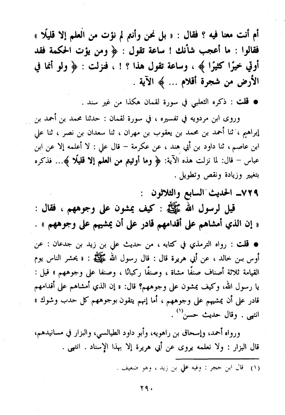 وَرَوَى ابْن مرْدَوَيْه فِي تَفْسِيره فِي سُورَة لُقْمَان حَدثنَا مُحَمَّد بن أَحْمد بن إِبْرَاهِيم حَدثنَا أَحْمد بن مُحَمَّد بن يَعْقُوب بن مهْرَان حَدثنَا سَعْدَان بن نصر حَدثنَا عَلّي ابْن عَاصِم حَدثنَا دَاوُد بن أبي هِنْد عَن عِكْرِمَة قَالَ عَلّي لَا أعلمهُ إِلَّا عَن ابْن عَبَّاس قَالَ لما نزلت هَذِه الْآيَة وَمَا أُوتِيتُمْ من الْعلم إِلَّا قَلِيلا ... فَذكره بتغيير وَزِيَادَة وَنقص وَتَطْوِيل