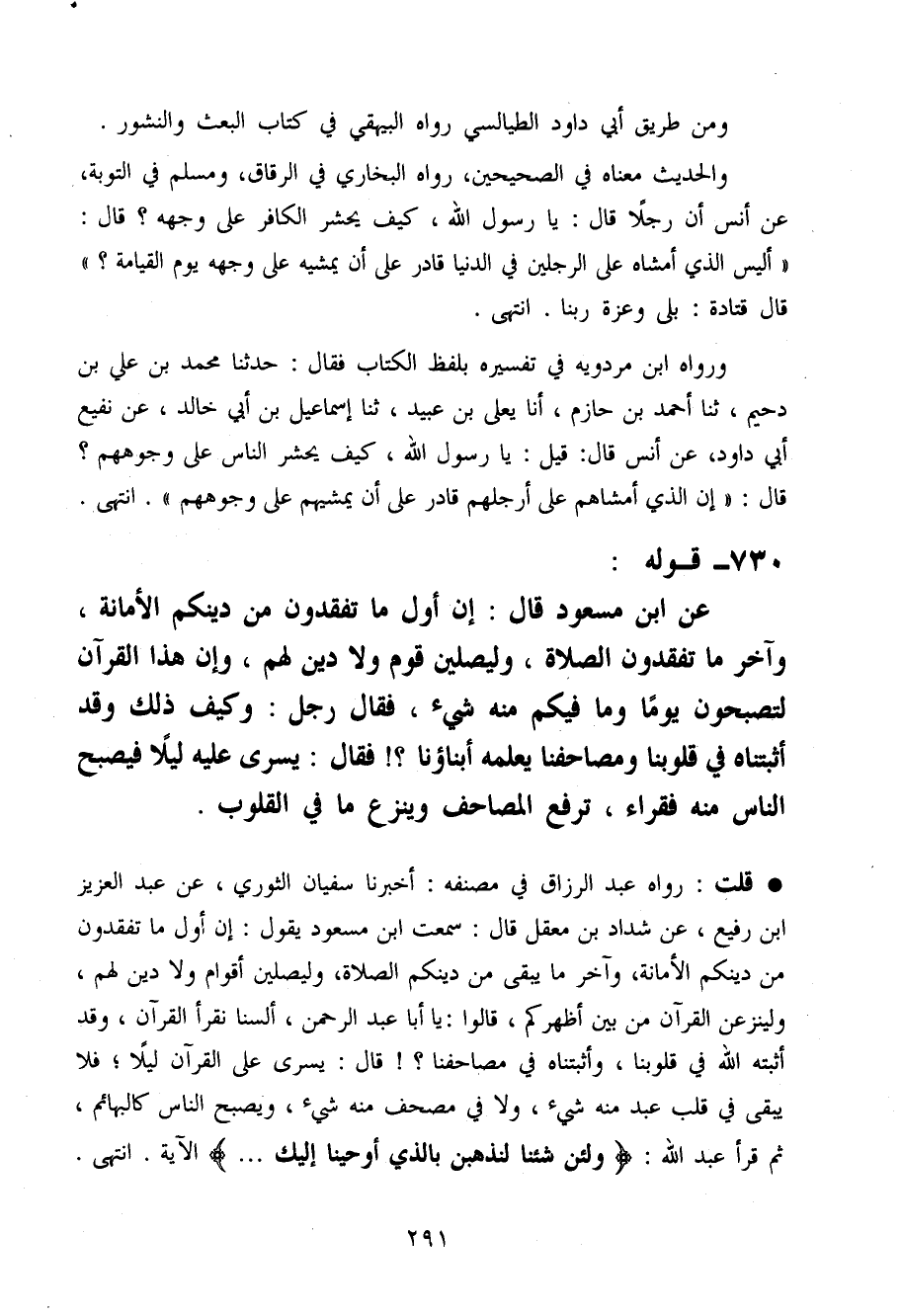 730 - قَوْله عَن ابْن مَسْعُود قَالَ إِن أول مَا تَفْقِدُونَ من دينكُمْ الْأَمَانَة وَآخر مَا تَفْقِدُونَ الصَّلَاة وَلْيُصَلِّينَ قوم وَلَا دين لَهُم وَإِن هَذَا الْقُرْآن لتصبحون يَوْمًا وَمَا فِيكُم مِنْهُ شَيْء فَقَالَ رجل وَكَيف ذَلِك وَقد أَثْبَتْنَاهُ فِي قُلُوبنَا وَمَصَاحِفنَا يُعلمهُ أَبْنَاؤُنَا فَقَالَ يسري عَلَيْهِ لَيْلًا فَيُصْبِح النَّاس مِنْهُ فُقَرَاء ترفع الْمَصَاحِف وَينْزع مَا فِي الْقُلُوب