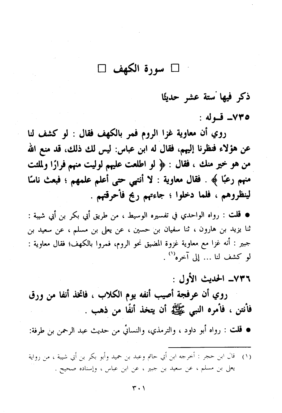 735 - قَوْله رُوِيَ أَن مُعَاوِيَة غزا الرّوم فَمر بالكهف فَقَالَ لَو كشف لنا عَن هَؤُلَاءِ فَنَظَرْنَا إِلَيْهِم فَقَالَ لَهُ ابْن عَبَّاس لَيْسَ لَك ذَلِك قد منع الله من هُوَ خير مِنْك فَقَالَ لَو اطَّلَعت عَلَيْهِم لَوَلَّيْت مِنْهُم فِرَارًا وَلَمُلئت مِنْهُم رعْبًا