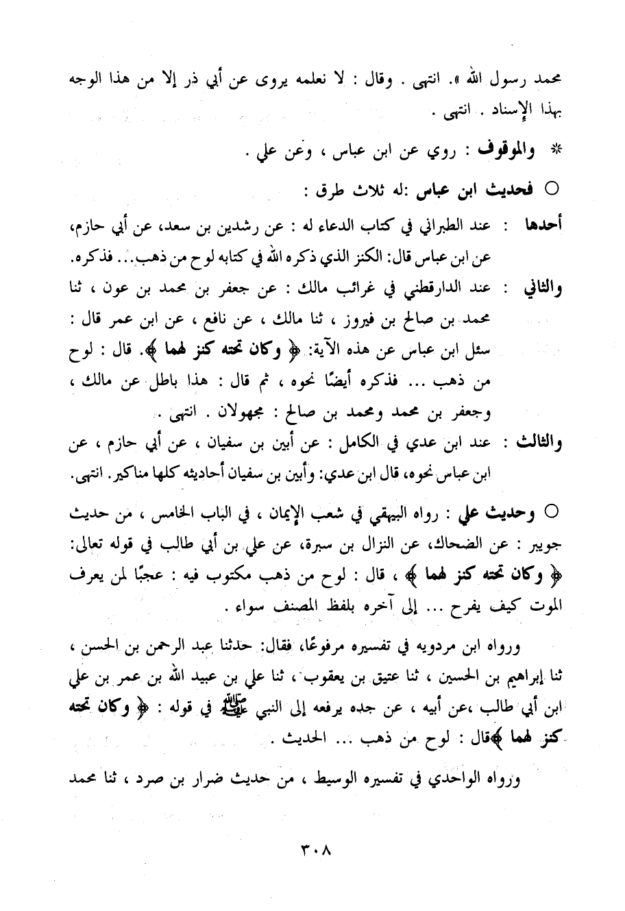 وَالثَّانِي عِنْد الدَّارَقُطْنِيّ فِي غرائب مَالك عَن جَعْفَر بن مُحَمَّد بن عون حَدثنَا مُحَمَّد بن صَالح بن فَيْرُوز حَدثنَا مَالك عَن نَافِع عَن ابْن عمر قَالَ سُئِلَ ابْن عَبَّاس عَن هَذِه الْآيَة وَكَانَ تَحْتَهُ كنز لَهما قَالَ لوح من ذهب ... فَذكره أَيْضا نَحوه ثمَّ قَالَ هَذَا بَاطِل عَن مَالك وجعفر بن مُحَمَّد وَمُحَمّد بن صَالح مَجْهُولَانِ