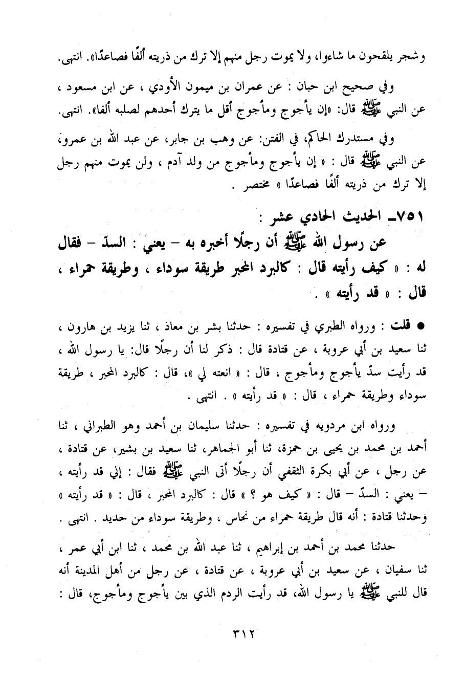 قلت وَرَوَاهُ الطَّبَرِيّ فِي تَفْسِيره حَدثنَا بشر بن معَاذ حَدثنَا يزِيد بن هَارُون حَدثنَا سعيد بن أبي عرُوبَة عَن قَتَادَة قَالَ ذكر لنا أَن رجلا قَالَ يَا رَسُول الله قد رَأَيْت سد يَأْجُوج وَمَأْجُوج قَالَ (انْعَتْهُ لي) قَالَ كَالْبردِ المحبر طَريقَة سَوْدَاء وَطَرِيقَة حَمْرَاء قَالَ (قد رَأَيْته)