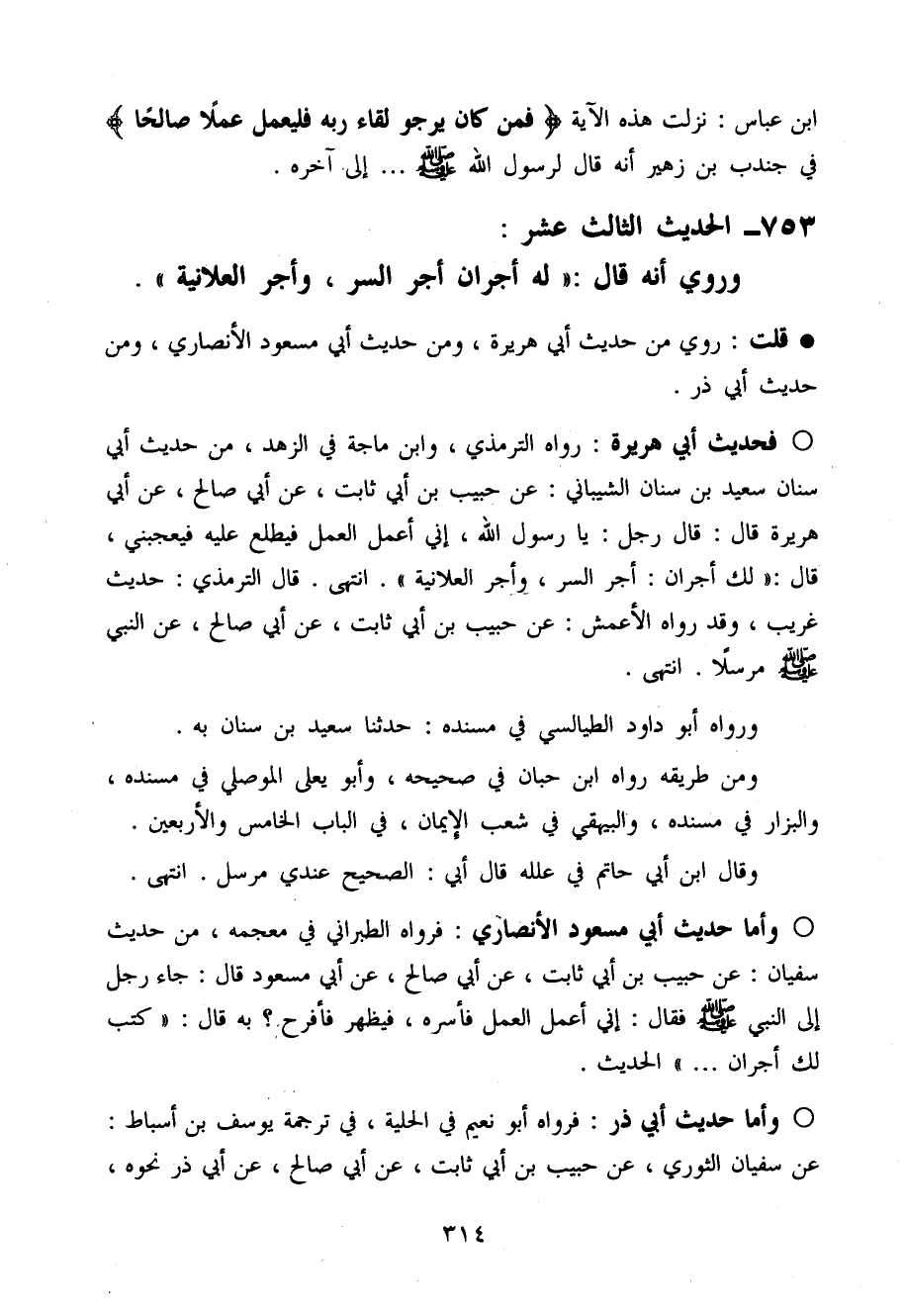وَأما حَدِيث أبي مَسْعُود الْأنْصَارِيّ فَرَوَاهُ الطَّبَرَانِيّ فِي مُعْجَمه من حَدِيث سُفْيَان عَن حبيب بن أبي ثَابت عَن أبي صَالح عَن أبي مَسْعُود قَالَ جَاءَ رجل إِلَى النَّبِي صَلَّى اللَّهُ عَلَيْهِ وَسَلَّم َ فَقَالَ إِنِّي أعمل الْعَمَل فَأسرهُ فَيظْهر فَأَفْرَح بِهِ قَالَ كتب لَك أَجْرَانِ) الحَدِيث