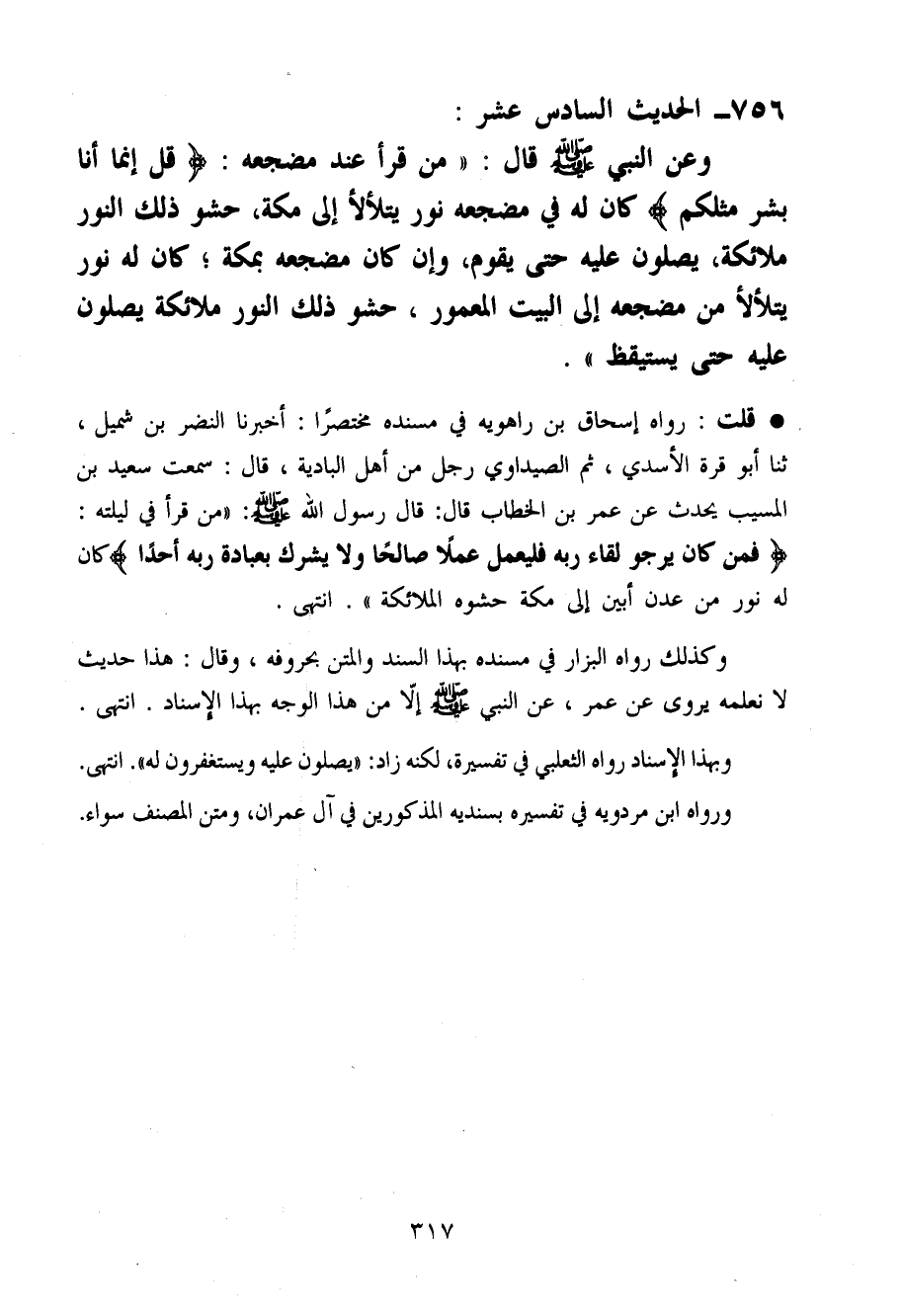 قلت رَوَاهُ إِسْحَاق بن رَاهَوَيْه فِي مُسْنده مُخْتَصرا أخبرنَا النَّضر بن شُمَيْل حَدثنَا أَبُو قُرَّة الْأَسدي ثمَّ الصَّيْدَاوِيُّ رجل من أهل الْبَادِيَة قَالَ سَمِعت سعيد بن الْمسيب يحدث عَن عمر بن الْخطاب قَالَ قَالَ رَسُول الله صَلَّى اللَّهُ عَلَيْهِ وَسَلَّم َ (من قَرَأَ فِي ليلته فَمن كَانَ يَرْجُو لِقَاء ربه فليعمل عملا صَالحا وَلَا يُشْرك بِعبَادة ربه أحدا كَانَ لَهُ نور من عدن أبين إِلَى مَكَّة حشْوَة الْمَلَائِكَة)