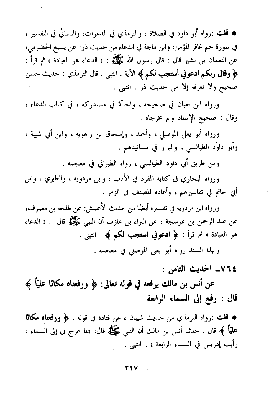 قلت رَوَاهُ أَبُو دَاوُد فِي الصَّلَاة وَالتِّرْمِذِيّ فِي الدَّعْوَات وَالنَّسَائِيّ فِي التَّفْسِير فِي سُورَة حم غَافِر الْمُؤمن وَابْن ماجة فِي الدُّعَاء من حَدِيث ذَر عَن يسيع الْحَضْرَمِيّ عَن النُّعْمَان بن بشير قَالَ قَالَ رَسُول الله صَلَّى اللَّهُ عَلَيْهِ وَسَلَّم َ (الدُّعَاء هُوَ الْعِبَادَة) ثمَّ قَرَأَ وَقَالَ ربكُم ادْعُونِي أَسْتَجِب لكم الْآيَة