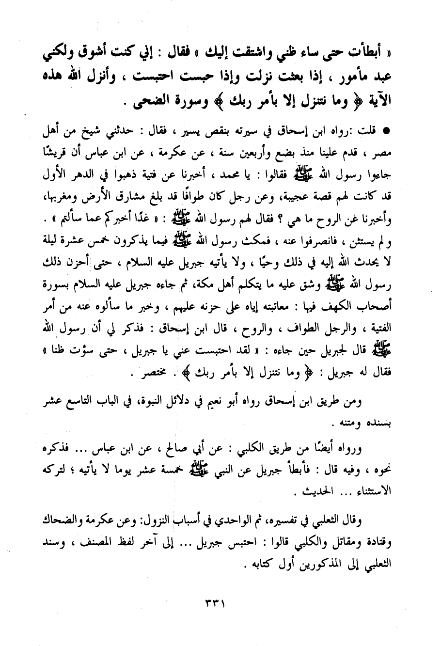 وَقَالَ الثَّعْلَبِيّ فِي تَفْسِيره ثمَّ الواحدي فِي أَسبَاب النُّزُول وَعَن عِكْرِمَة وَالضَّحَّاك وَقَتَادَة وَمُقَاتِل والكلبي قَالُوا احْتبسَ جِبْرِيل ... إِلَى آخر لفظ المُصَنّف وَسَنَد الثَّعْلَبِيّ إِلَى الْمَذْكُورين أول كِتَابه