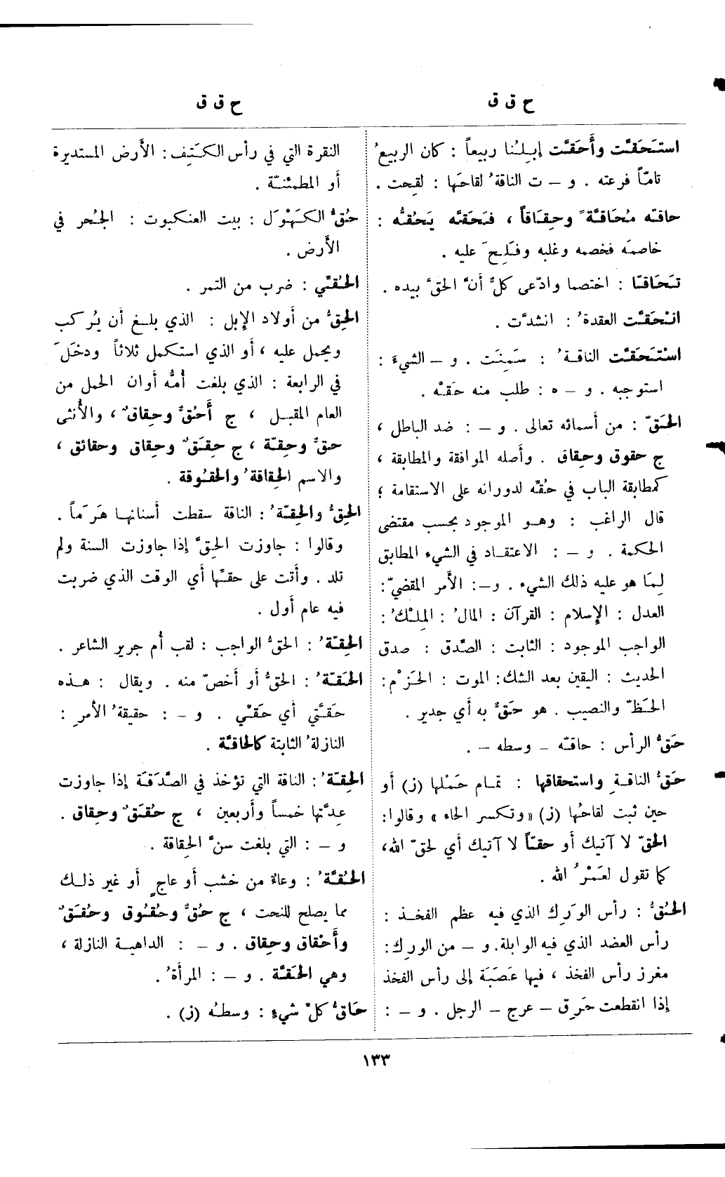 الحق من أولاد الإبل: الذي بلغ أن يركب ويحمل عليه، أو الذي استكمل ثلاثًا ودخل في الرابعة: الذي بلغت أمه أوان الحمل من العام المقبل، ج أحقٌ وحقاقٌ، والأنثى حق وحقة، ج حققٌ وحقاق وحقائق، والاسم الحقاقة والحقوقة.