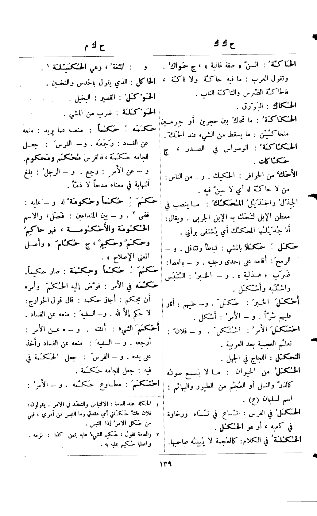 حكمه- حكمًا: منعه عما يريد: منعه عن الفساد: رجعه. و- الفرس: جعل للجامه حكمة، فالفرس محكم ومحكوم. و- عن الأمر: رجع. و- الرجل: بلغ النهاية في معناه مدحًا لا ذمًا.