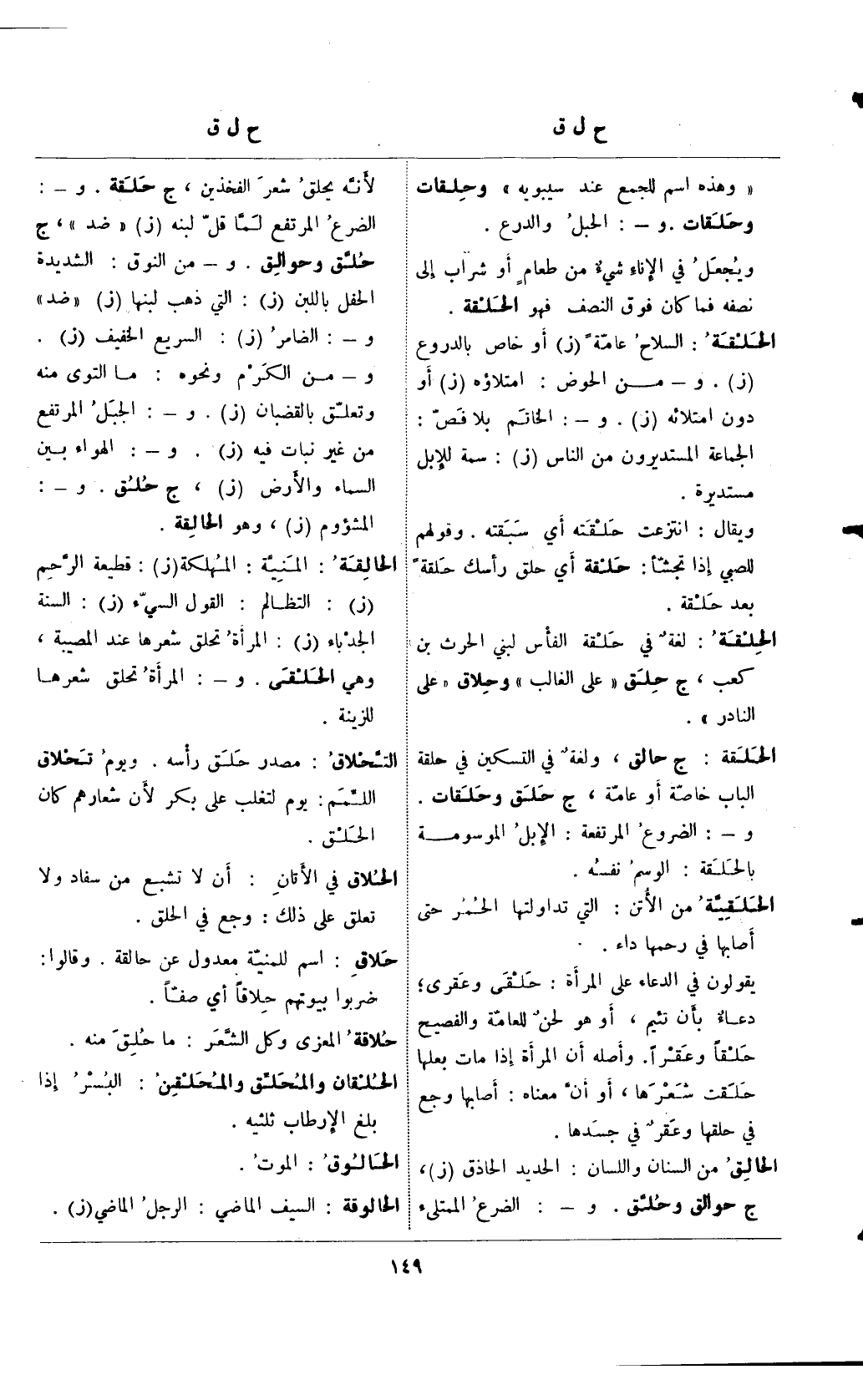 الحلقة: لغةٌ في حلقة الفأس لبني الحرث بن كعب، ج حلق "على الغالب" وحلاق "على النادر".
