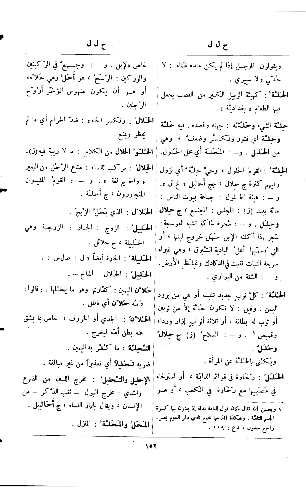 الحلة: القوم الحلول، وهي حلةٌ أي نزول وفيهم كثرة ج حلال، جج أحاليل "غ ق". و-: هيئة الحلول: جماعة بيوت الناس: مائة بيت (ز): المجلس: المجتمع، ج حلال وحلل. و-: شجرة شاكة تشبه العوسجة: شجر إذا أكلته الإبل سهل خروج لبنها، أو التي يسميها أهل البادية الشبرق، وهي غبراء سريعة النبات تنبت في الدكادك وغلظ الأرض. و-: الشقة من البواري.