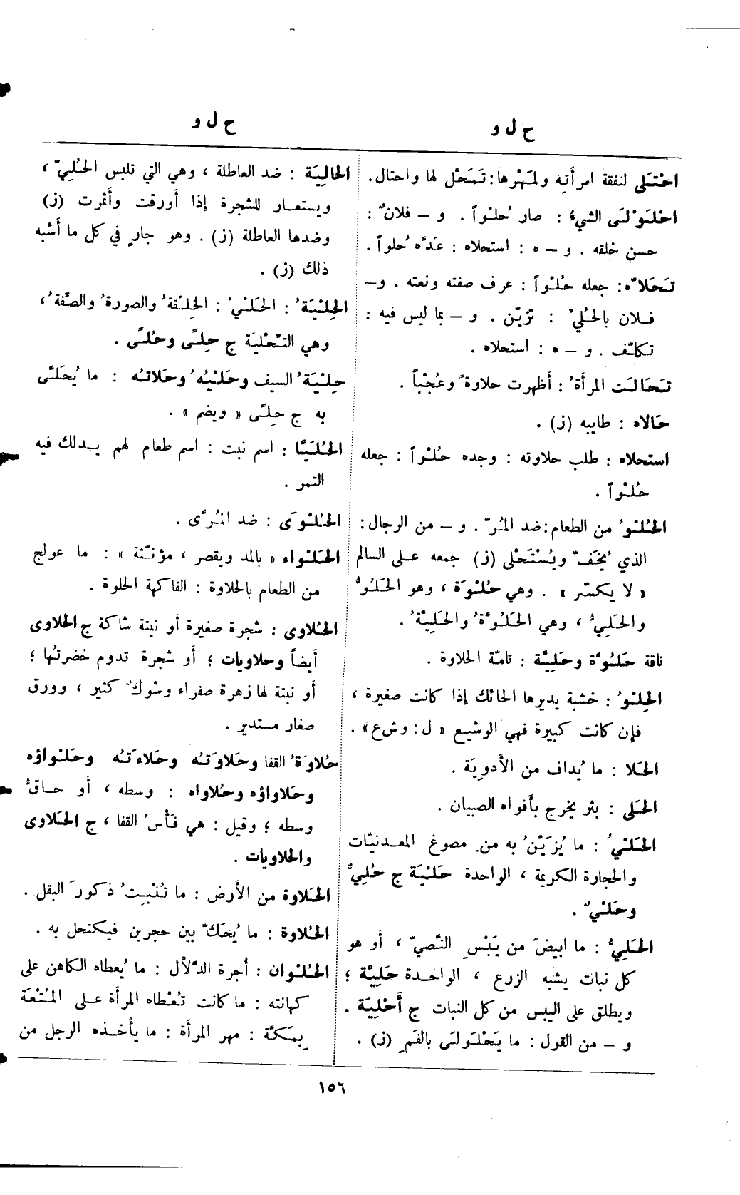 الحلو من الطعام: ضد المر. و- من الرجال: الذي يخف ويستحلى (ز) جمعه على السالم "لا يكسر". وهي حلوة، وهو الحلو والحلي، وهي الحلوة والحلية.