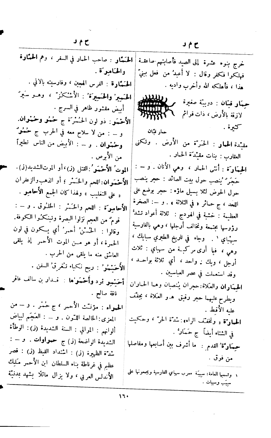 الحمارة: أنثى الحمار، وهي الأتان. و-: حجرٌ ينصب حول بيت الصائد: حجر ينصب حول الحوض لئلا يسيل ماؤه: حجر يوضع على اللحد، ج حمائر "في الثلاثة". و-: الصخرة العظيمة: خشبة في الهودج: ثلاثة أعواد تشد رؤوسها مجتمعة وتخالف أرجلها، وهي بالفارسية سهباي (¬1). وجاء في تاريخ الطبري سبايك، وهي، فيما أرى مركبة من سهباي: ثلاث أرجل، ويك: واحد، أي ثلاثة بواحد، وقد استعملت في عضر العباسيين.