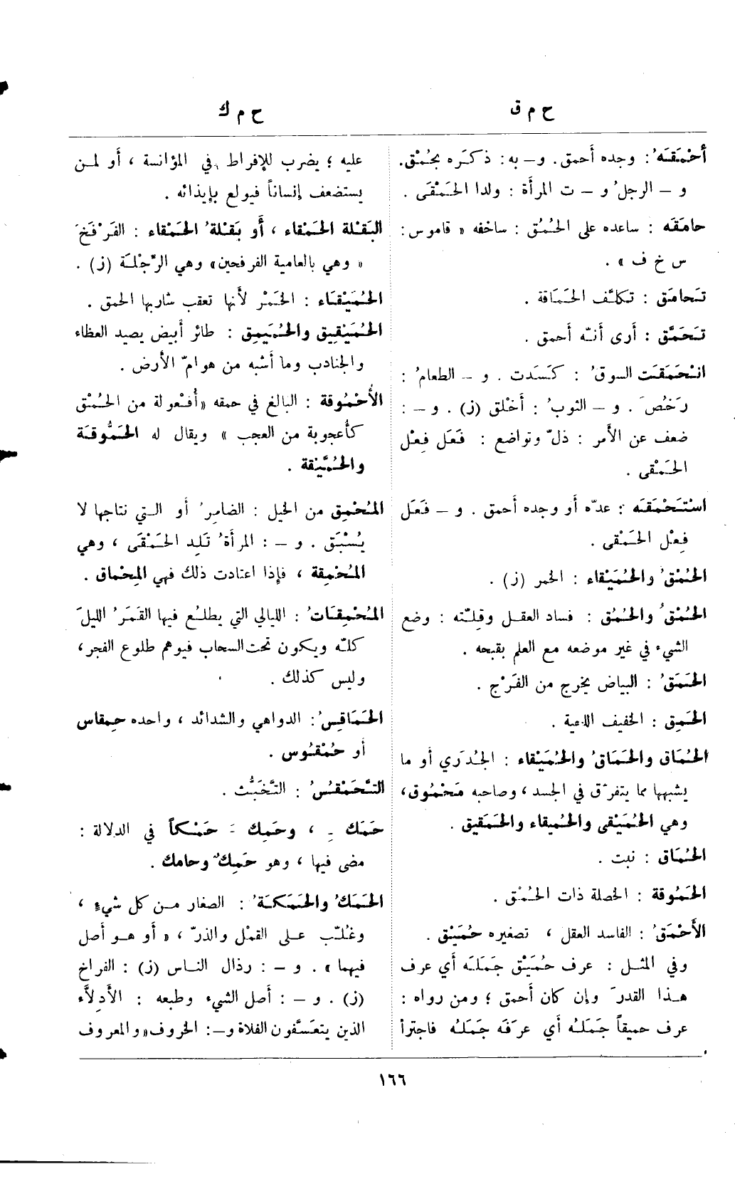 المحمق من الخيل: الضامر أو التي نتاجها لا يسبق. و-: المرأة تلد الحمقى، وهي المحمقة، فإذا اعتادت ذلك فهي المحماق.