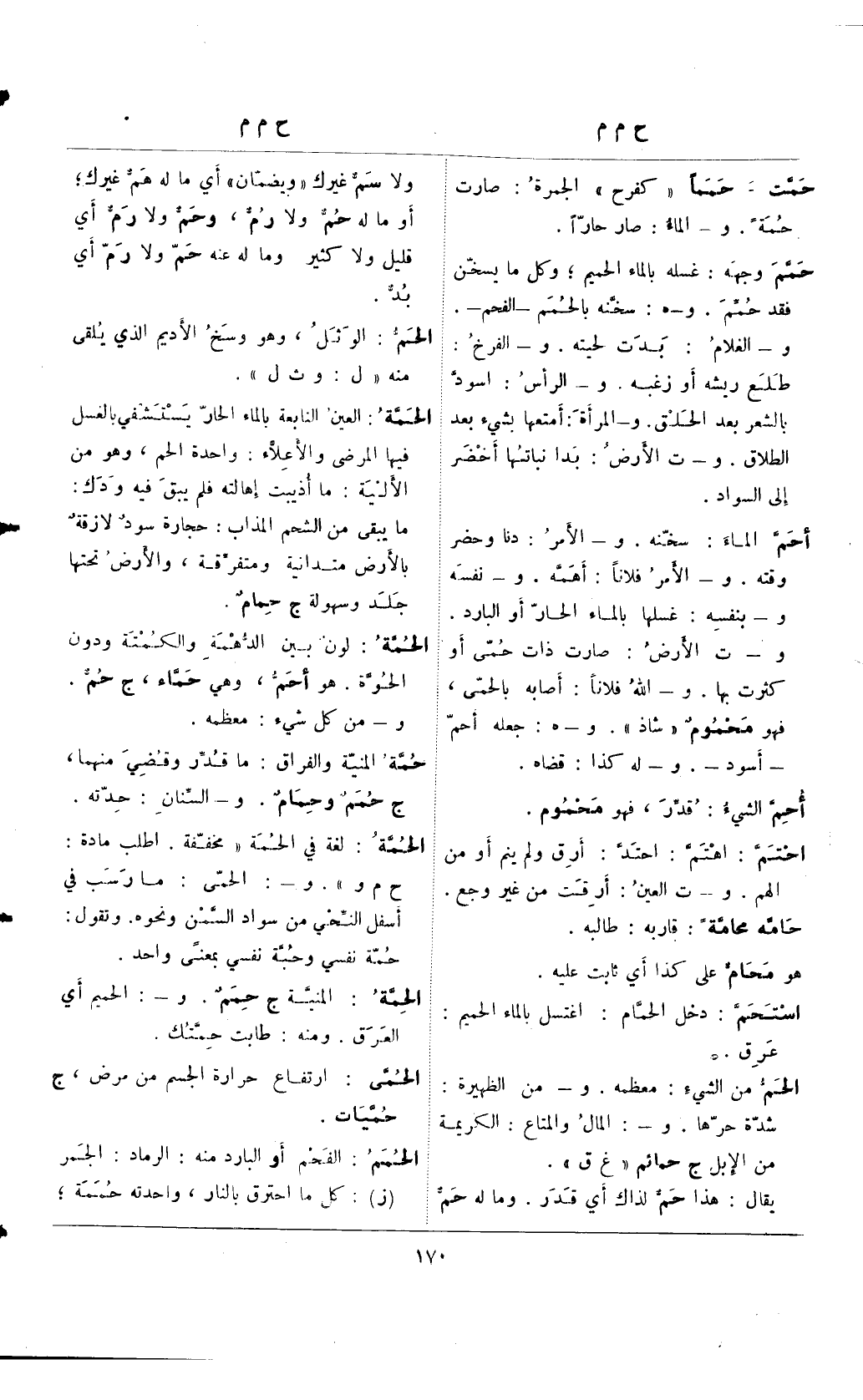 الحمة: العين النابعة بالماء الحار يستشفى بالعسل فيها المرضى والأعلاء: واحدة الحم، وهو من الألية: ما أذيبت إهالته فلم يبق فيه ودك: ما يبقى من الشحم المذاب: حجارة سودٌ لازقةٌ بالأرض متدانية ومتفرقة، والأرض تحتها جلد وسهولة ج حمامٌ.
